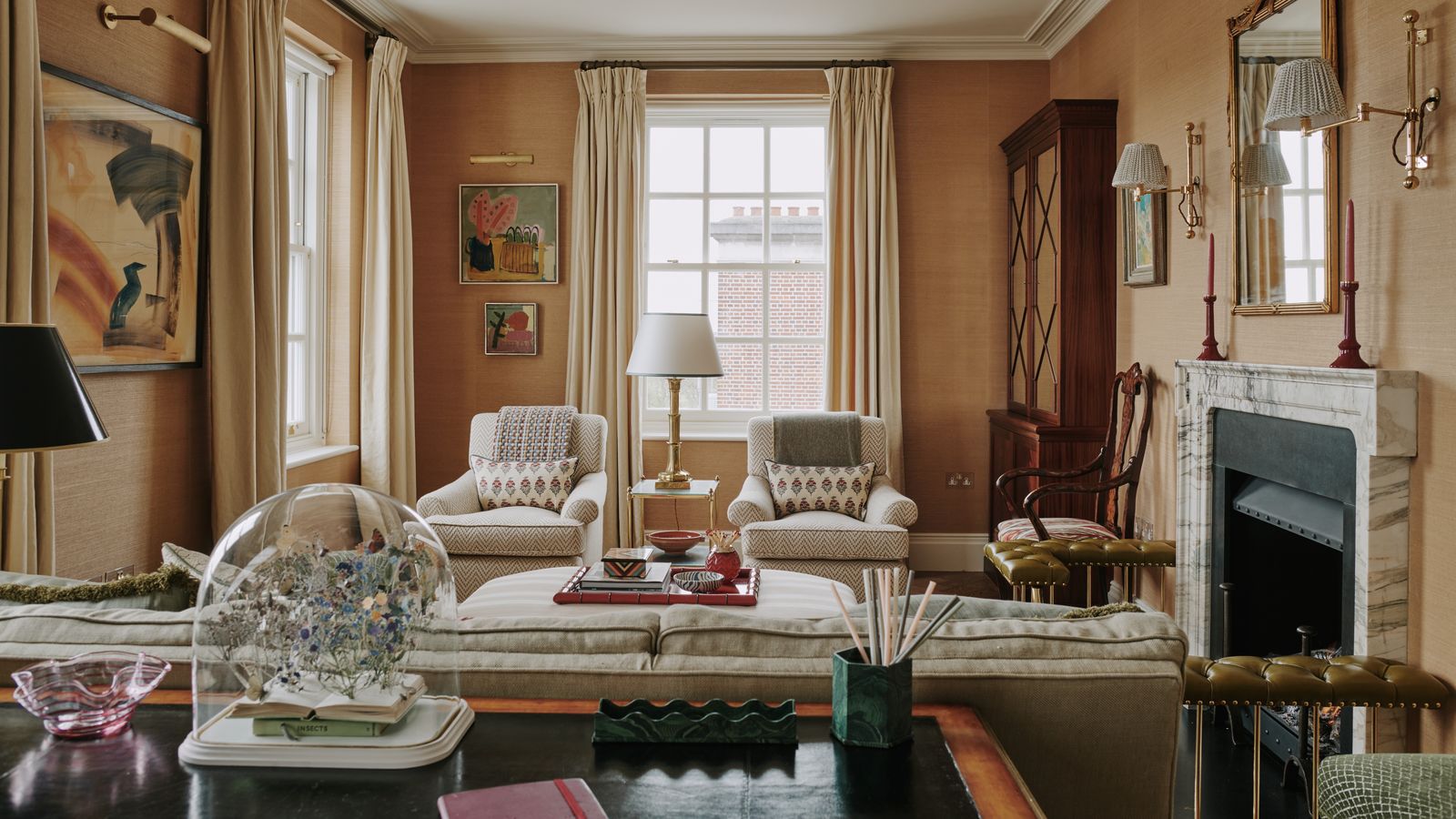 The sitting room and kitchen comprise one long and narrow space, divided up into zones for sitting, dining and cooking. As the clients weren't particularly confident with colour, Mary and Nicole chose a grasscloth wallcovering and then enlivened it with punchier accessories, including ceramics from Henry Holland, gently patterned cushions, and large-scale artworks.