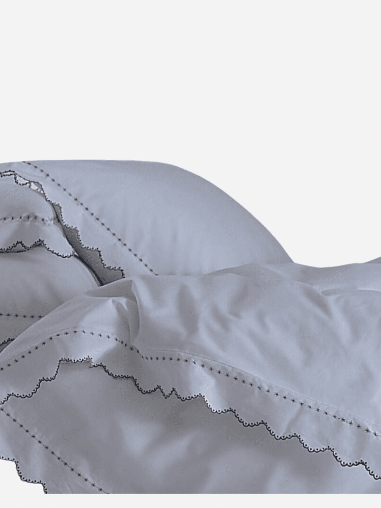 Half-tester beds are something of a signature for Salvesen Graham, and this lovely example jumps out against a classic chinoiserie wallcovering. Crisp white bedding is given a subtly pretty and feminine touch with a grey frilled trim, and as luck would have it, it's reasonably affordable at one of our favourite shops, Cologne & Cotton.