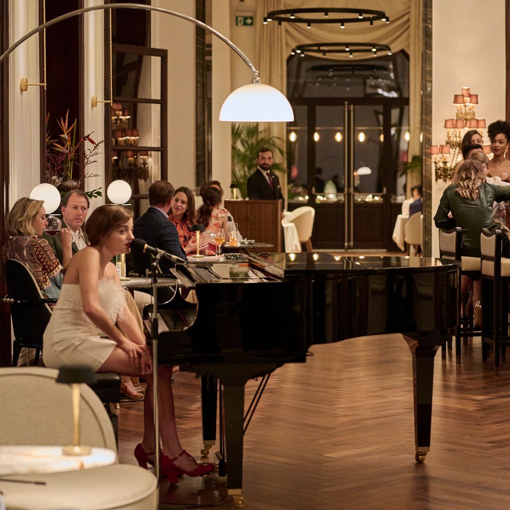 We’ve already covered how extra Quentin’s serve-ware is, but another appreciated detail is his villa’s commitment to gallery walls atop dense wallpaper. Sure, it’s not that irregular within the realm of old world Italian villas, but we appreciate resting our eyes on ’em just the same. Per our tour of the villa that predates The White Lotus, this particular wallpaper is a Gainsborough silk damask.