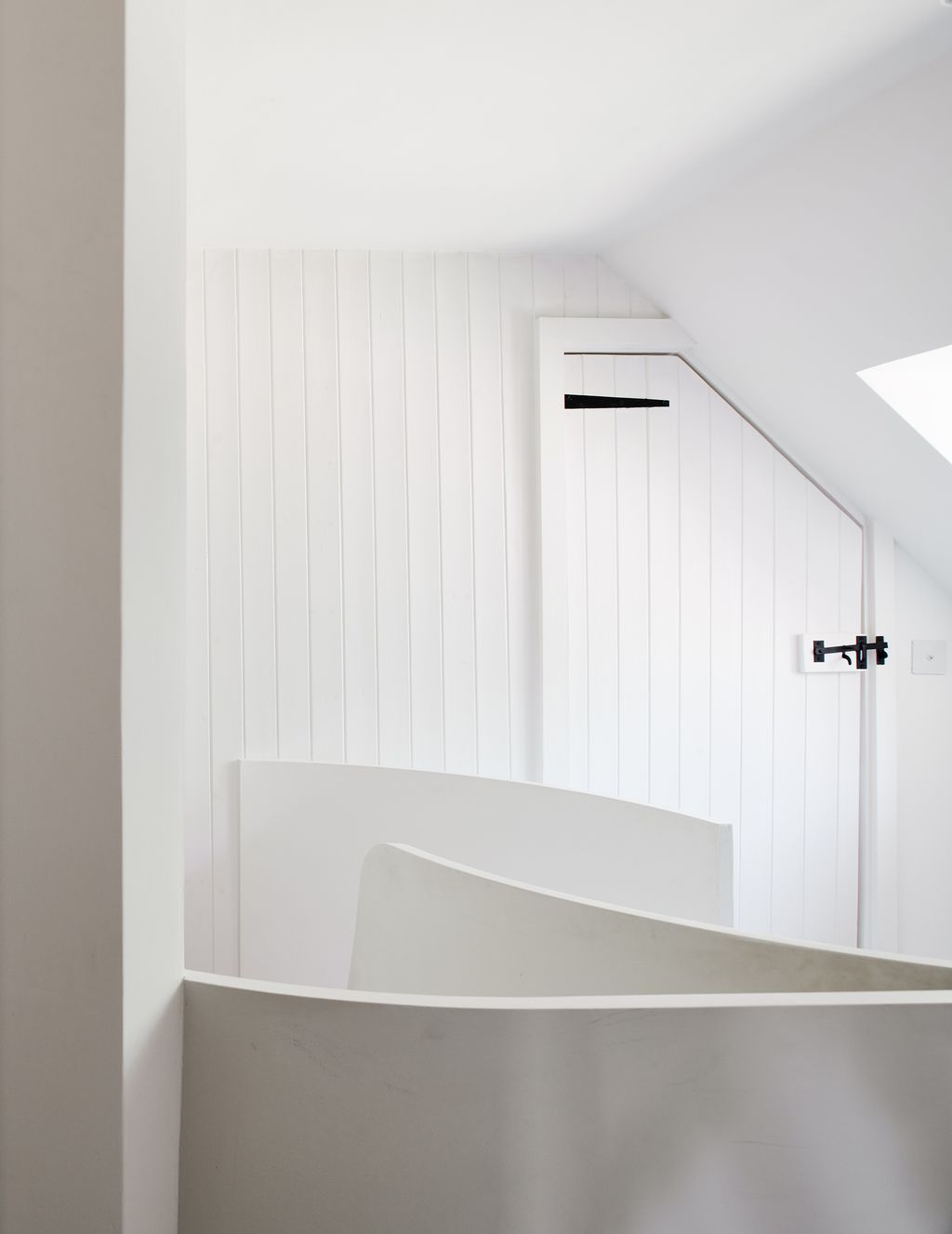 Replacing an awkward Eighties flight of stairs with a spiral staircase (beautifully crafted by carpenter Brian Jones) saved space and also opened up a landing that connects the first-floor bedrooms. Instead of a solid central post, the staircase wraps around what Barnaby describes as a spiral ribbon, ‘We made it by laminating up birch plywood to form a hollow post.’