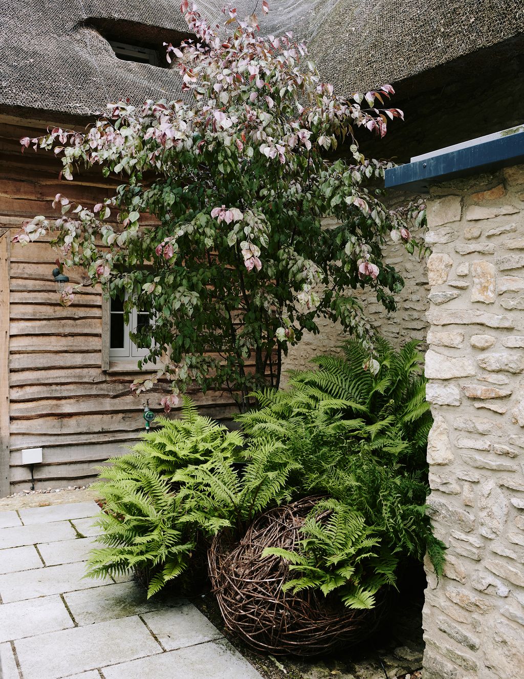 The front hall leads past the spiral staircase to the kitchen-dining room at the back, a single large space with picture windows on either side. The kitchen end has a gently vaulted ceiling, making it feel bigger than it is, and the cupboards and island are lined with raw reclaimed-oak planks, which are echoed by the rough-planked table the owners fell in love with and had shipped back from Spain. Sliding glass doors lead to a paved terrace outside, which Butter has edged with nepeta, ferns, woven willow balls and a multi-stemmed crab apple, Malus hupehensis ‘Cardinal’. ‘My brief was to keep it simple – to create a garden that worked with the cottage in both its old and new self,’ Butter says.