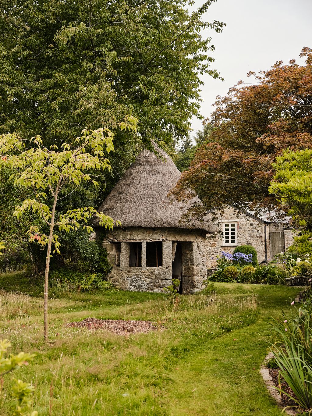 Blanche has gently added her own taste to the mix, papering the snug in a green grasscloth by the designer Totty Lowther, and turning the veranda into a conservatory with a table for informal dining. Blanche’s kitchen is warm and unfussy. She isn’t the kind of cook who goes in for gadgets, her only concession being the KitchenAid and her bean-to-cup coffee machine. The most important part of the room is her larder; ‘I like food stored at larder rather than fridge temperature and space to put the juices, jams and preserves that we make from the garden.’ There is also honey produced by the couple’s bees, with leftover wax being turned into handmade candles (‘Unbelievably time consuming to make, but they smell absolutely delicious’). But her most impactful changes have been in the garden, now lined with borders newly replanted by the garden designer Catherine Fitzgerald, with an extensive vegetable garden, greenhouses and an orangery currently under construction. The views from the house over Dartmoor are staggering, the lawn rolling straight on to a panorama of moorland and sky and no other buildings as far as the eye can see.