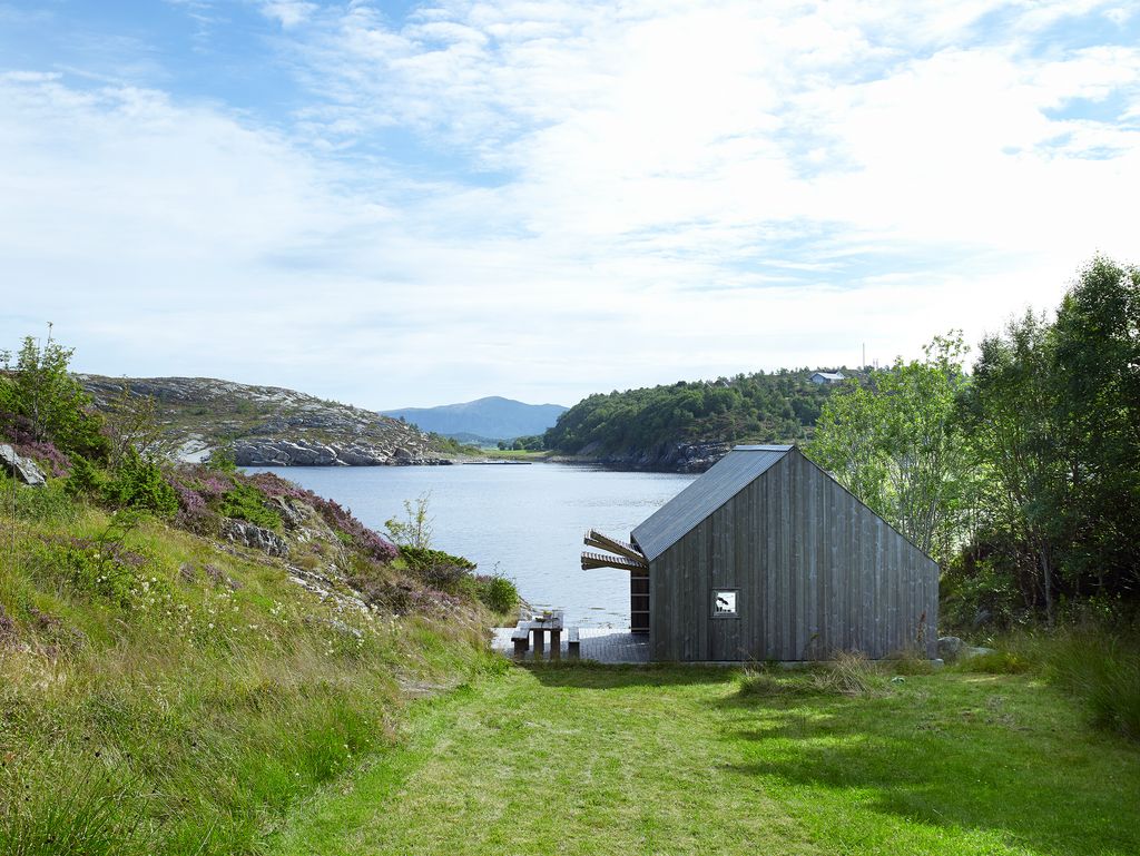 An enchanting Norwegian cabin built to resemble a boathouse on the water's edge