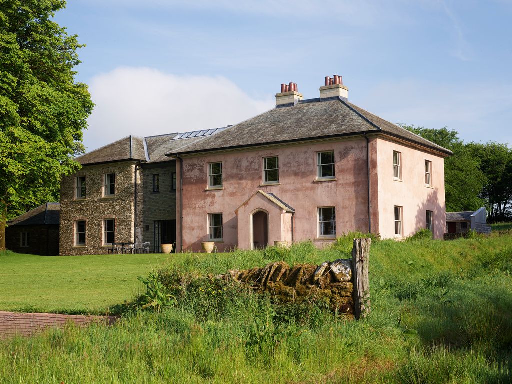They had to follow the footprint of the original house due to the strict planning permission, and many of its materials have been reused – flagstones, building stone, floorboards and even the roof slates, which are now on their third usage. ‘You can tell this from the number of fixing holes in them,’ explains Charles. The newbuild has been faced with three different exterior finishes. The apricot pink of the render on the main part derives from the local red sand, and looks wonderful against the tawny browns and golds of the moor in autumn. ‘And it doesn’t need any maintenance,’ he adds. Next to this, a recessed central part is faced with local slates, and, at the end, near a spinney of sycamores, the surface is of stone reclaimed from the original house and laboriously cut down to size. The pair worked with the architect Martin Llewellyn (since retired) of Llewellyn Harker Lowe.