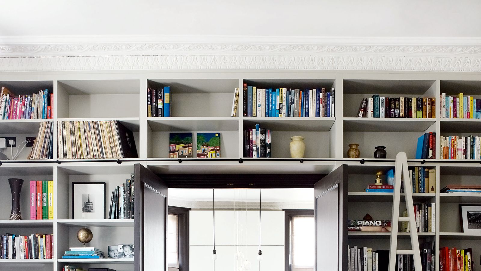 Midway along the central corridor is the staircase hall. Once a riot of orange varnish and fiddly rails, it has been transformed into a dignified, sober space, with dark blue-grey panelling and pale grey walls. The balusters have been replaced by simple metal rails, each decorated with a single brass ring, while a specially commissioned chandelier from Michael Anastassiades hangs overhead.
