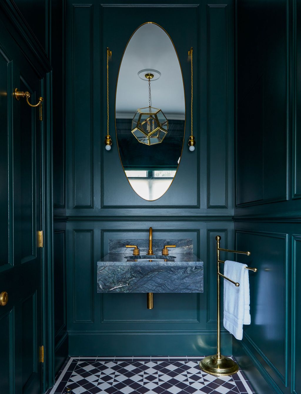 Three further bedrooms follow, each styled in a strikingly different way: one is dominated by bold wallpaper from Phillip Jeffries; another plays on different shades of green. ‘Here, a lot of the subliminal effect is about horizontals versus verticals, while the brass-framed mirrors echo the curves of the fireplace,’ Ebba explains.