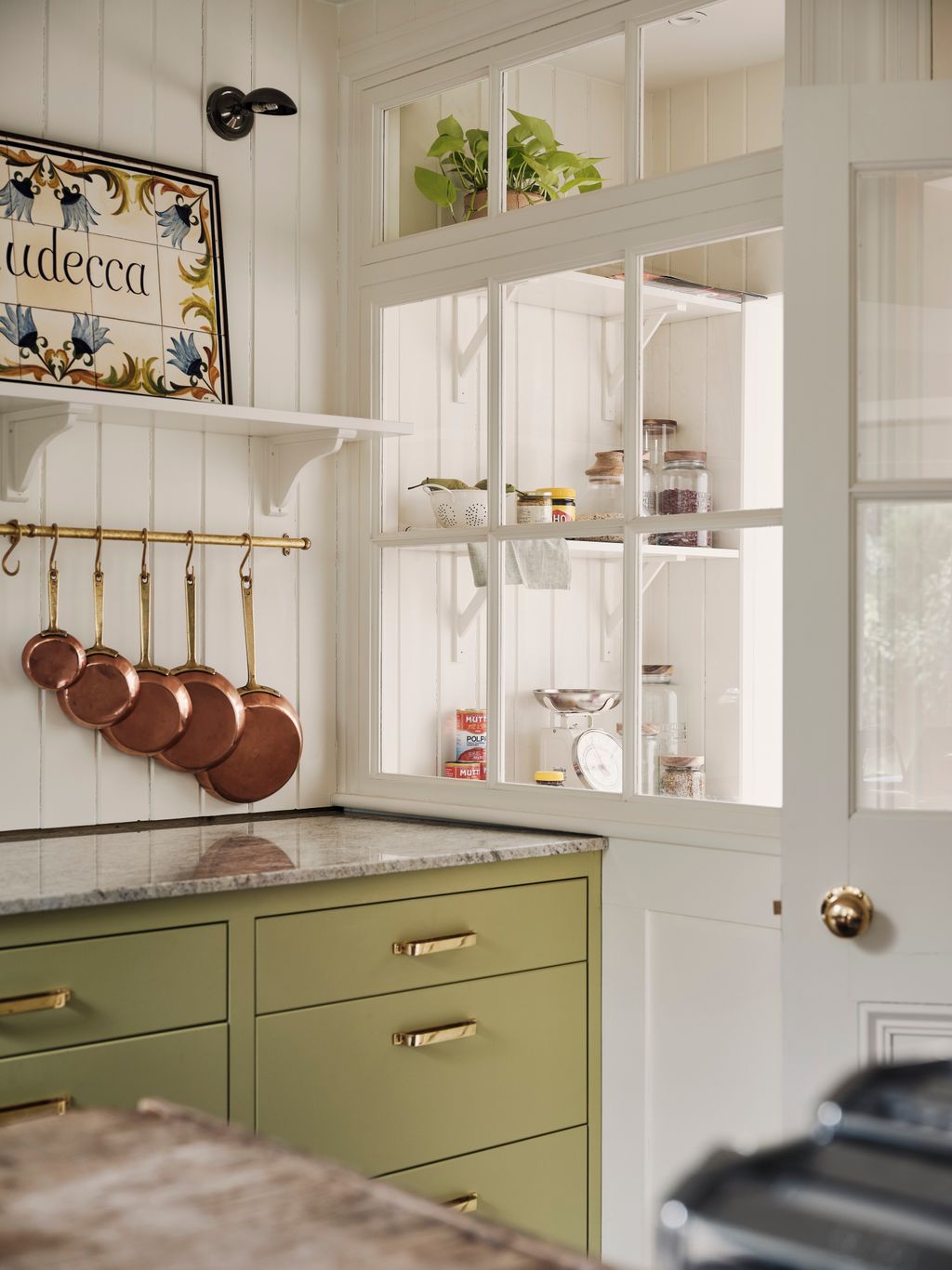 Although the Arts & Crafts period of the house is certainly in evidence in the interiors, so are lots of other elements of the past, and this allows for an overall sense of timelessness. The ivy pattern of the House of Hackney wallpaper in the hallway feels like an updated version of Victorian design, while the elegant joinery on the window seats is reminiscent of Art Deco motifs. One of the cleverest things about the house is the use of bespoke pieces or customised antiques, which lend character and patina to the interiors while still being entirely convenient and functional. One such piece is the sink unit in the kitchen, a bespoke piece of furniture designed especially for the space, but which has the air of an antique. As the appetite for immaculate fitted kitchens seems to be on the wane, this is a charming idea to steal. Also in the kitchen, an old refectory table was deftly modified with extra shelving to make it work as an island with plenty of storage.
