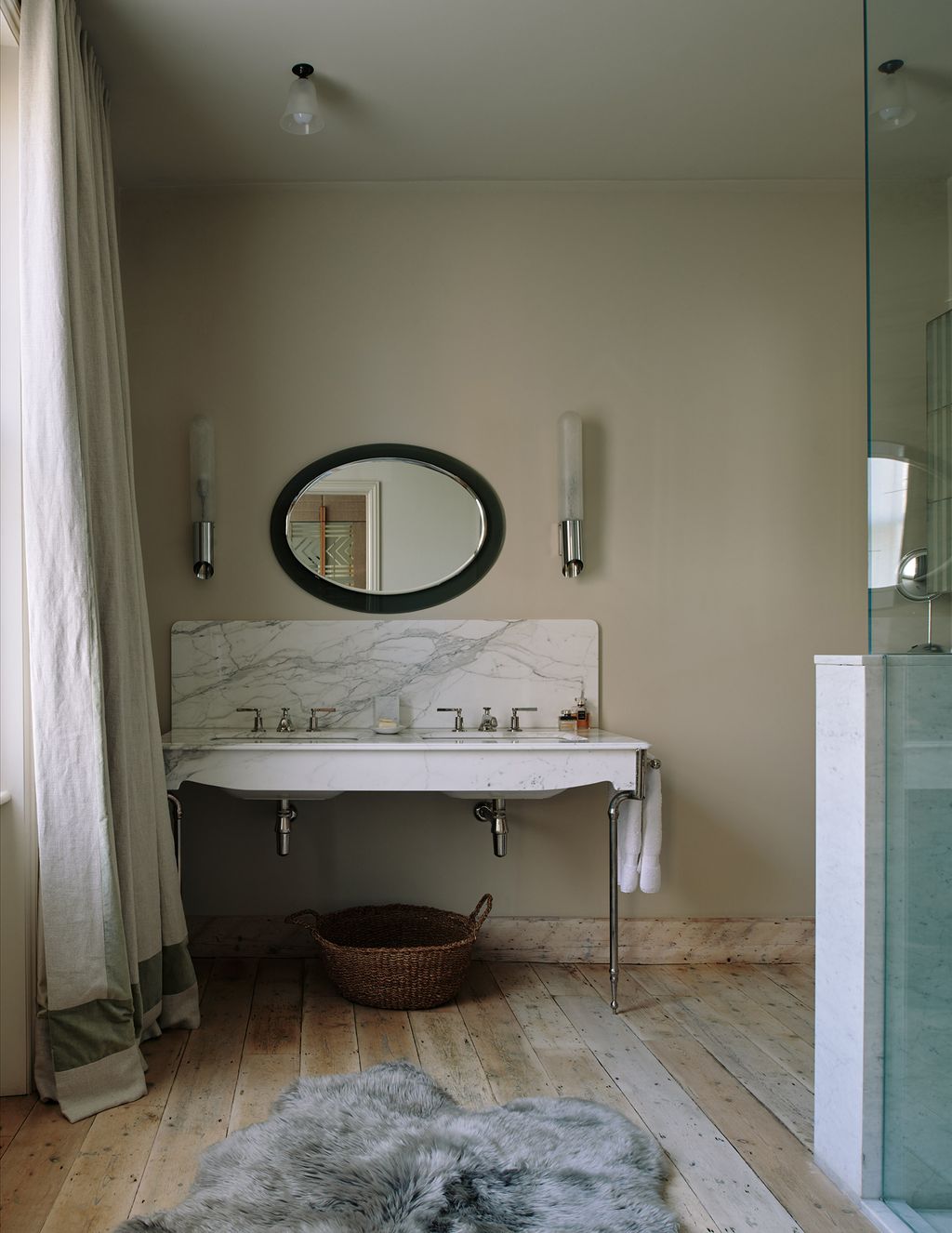 The first floor is given over entirely to the main bedroom, with a generous bathroom at the front and a study to one side. In the bathroom are bespoke wardrobes created from artdeco glass panels rescued from Unilever House, EC4, set within a linen-upholstered framework, and finished in reclaimed iroko hardwood. There are also salvaged elements in the bathroom on the second floor: its Crittall doors, with their original paintwork, enjoyed a former life at the London School of Economics. Even the bath surround is in reclaimed iroko wood – though the vintage-looking tiles above it are actually a modern design by Emery & Cie.