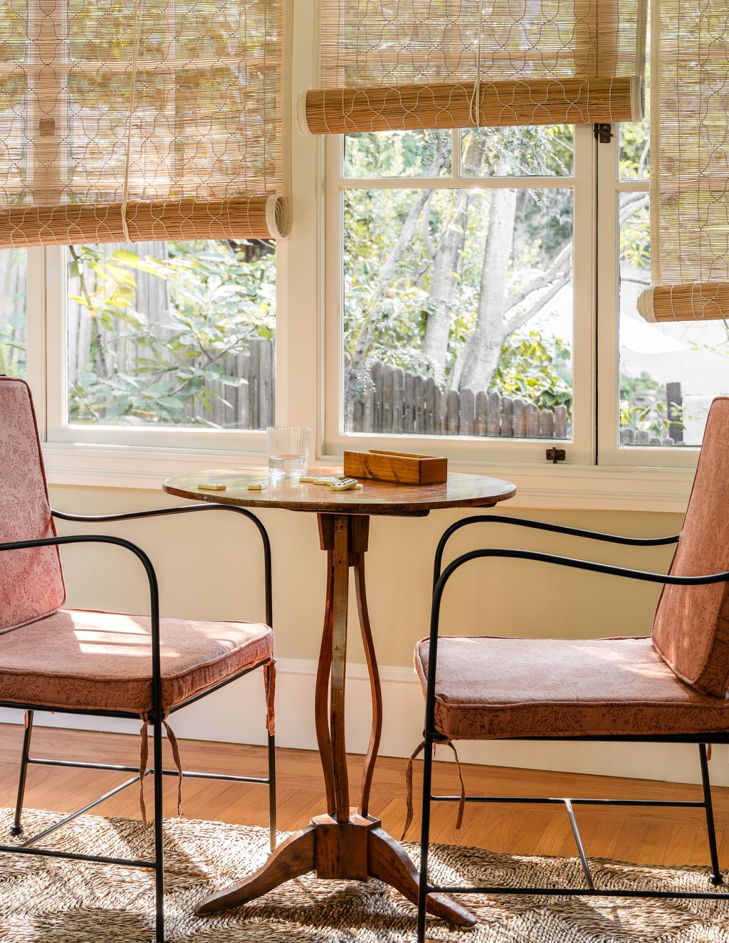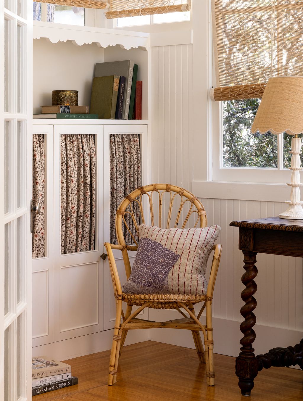 Just inside the front door, there’s a nook with tall, multi-paned windows and built-in daybeds. The main living area is divided into a sitting room with a fireplace to gather round in the evening, and a ‘listening room’ for playing music and relaxing. ‘We designed a built-in the bench that mimics the existing joinery. This is where they play records and enjoy the dappled sunlight that makes this property so special.’ Gossamer thin bamboo Indian chik blinds were added to diffuse the light and give the space a feeling of warmth and rusticity.
