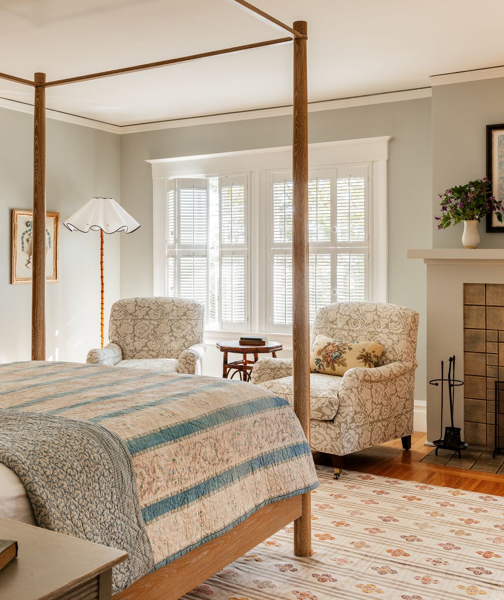 ‘Because the first floor leans dark, the owners wanted the second floor - which houses a bedroom, bathroom, office and small garden room - to be airy and light. We kept the existing shutters, and chose some very pretty, feminine textiles, like a vintage quilt for the bed and an antique kilim rug in the main bedroom.’