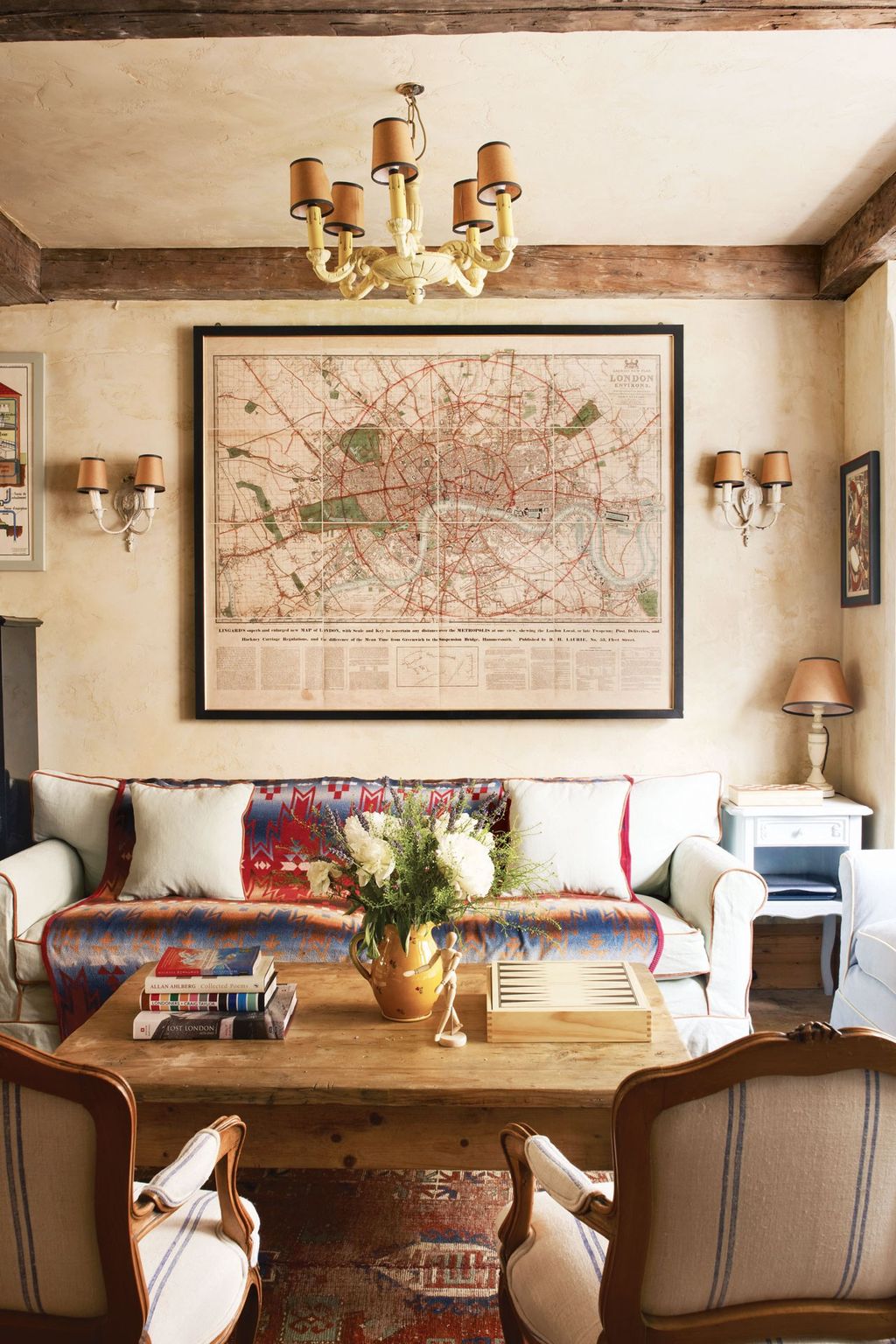 Pine was used for the kitchen cabinets, sitting-room chimneypiece and children's bunk beds. Keith used Vermont pine, rather than pale English wood, preferring its rich warmth and depth. All this was made in New York and shipped over, as were the reconditioned tiles, most of which are over 100 years old and come from demolished or refurbished factories.
