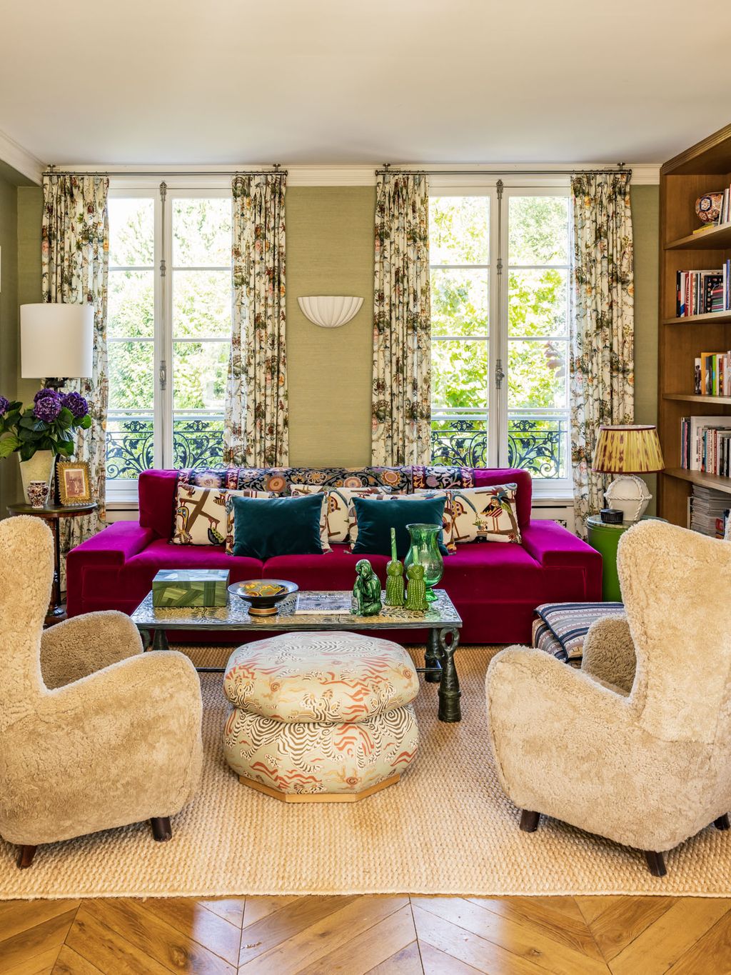 The main bedroom is situated above the dining room and, similarly, is the largest and brightest room on that floor. It has a chinoiserie wallpaper from Pierre Frey and a pair of green bedside tables once owned by the late, great American interior designer Dorothy Draper.