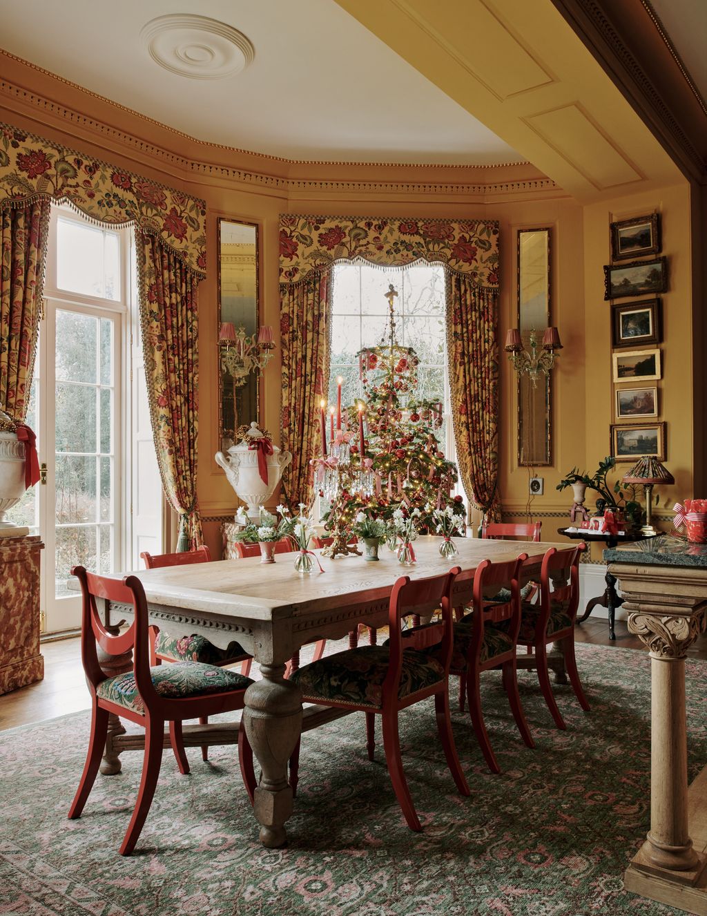 He also knew he wanted it to be yellow – ‘like sunshine even on a dark winter’s day’. As daylight fades, it takes on a golden hue and the room simply glows, thanks in no small part to the dimmed lights and candles – there are no fewer than 20 of the former and 20 of the latter. The light catches the now-gilded plasterwork cornice and original pine fire surround, stripped of layers of paint, part-gilded and festooned at this time of year with evergreen garlands.