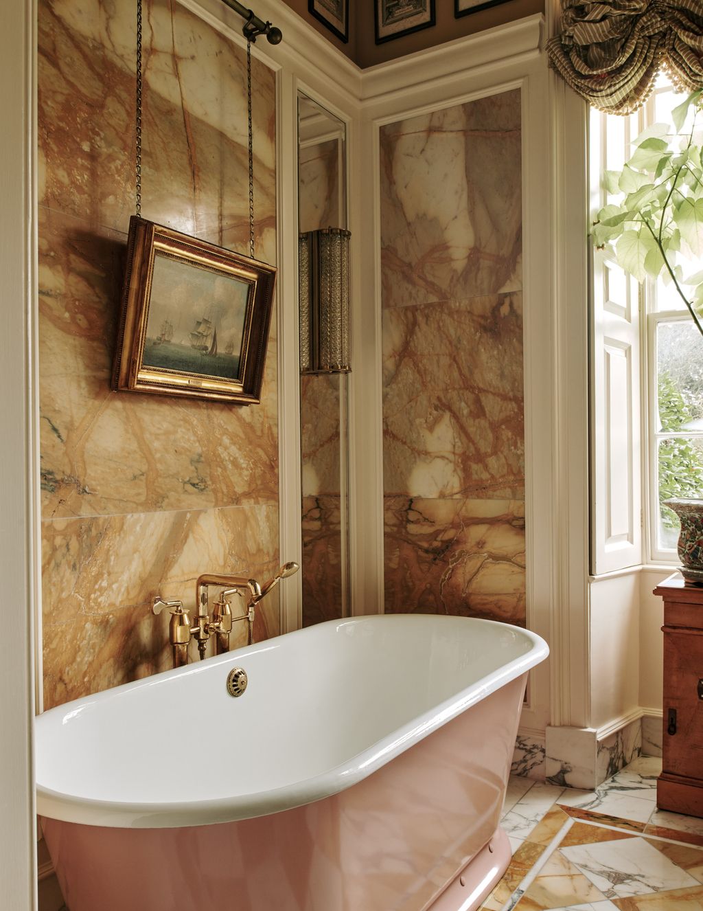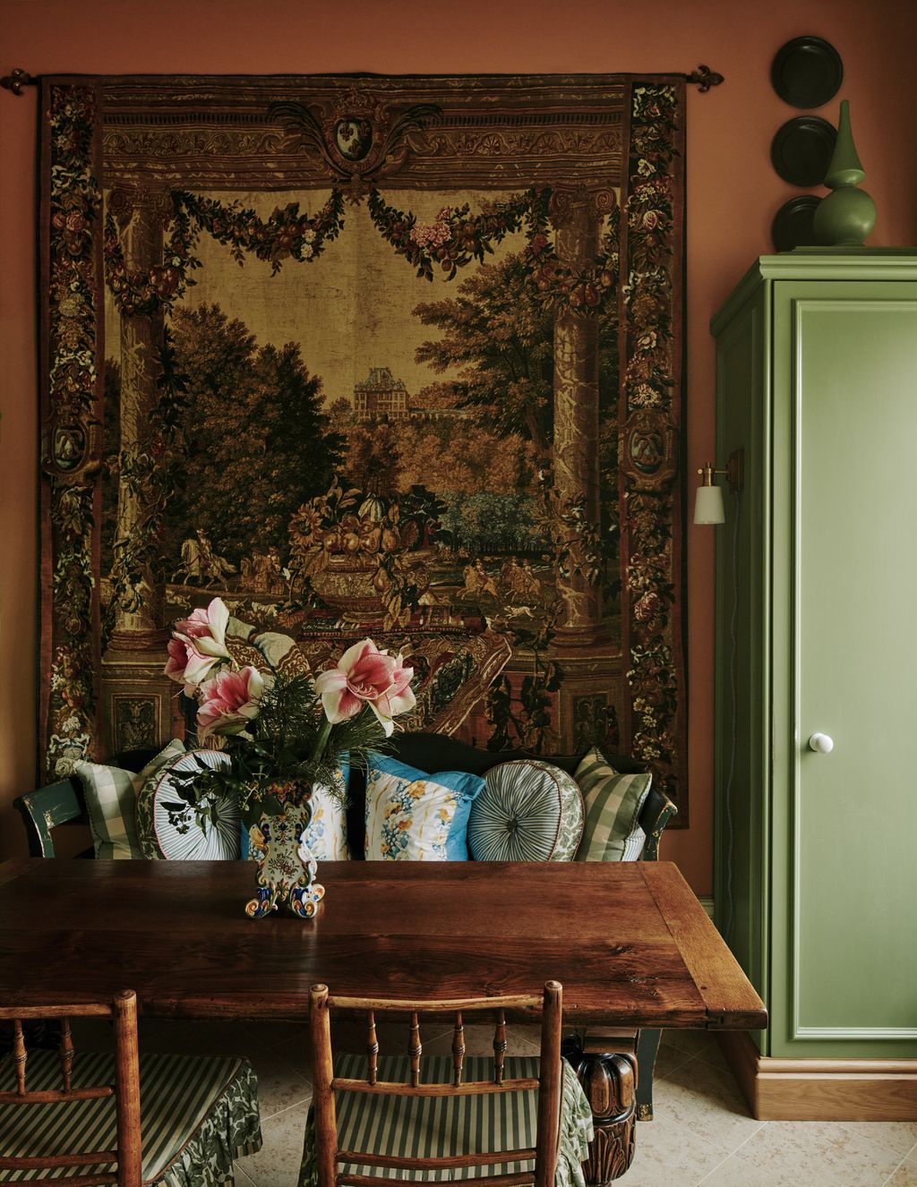 If you ever find yourself wondering what to do with a kitchen that has 3.7-metre ceilings, the answer, it seems, is to create four finial-topped towers and place them in the corners of the room. These tall cabinets disguise the fridge-freezer, the washer and dryer, and lots of storage, and add a sense of drama to a room that also features a veined white marble splashback creeping high up an orange wall. This is set off by a collection of pewter and porcelain plates, among them some once owned by Nancy Lancaster, and balanced by an antique tapestry on the adjacent wall.