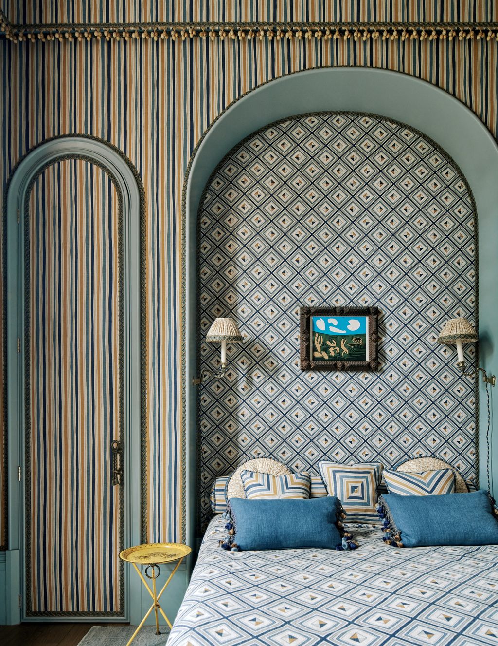 The bedrooms are a full-throated celebration of fabric and detailing. In the main bedroom, Jean Monro’s foxglove-patterned ‘Lustmore’ linen takes centre stage: it covers the walls and is used for the curtains, pelmet and bedcover. The blue-green from the print reappears in the Samuel & Sons trimmings, while the pink is repeated on the ceiling, in ‘Rose’ by Edward Bulmer Natural Paint. Side note: Edward Bulmer’s website says this colour will ‘give your bedroom some pizzazz’. And that is no lie. The tented ceiling and the walls of the spare room are in a combination of two fabrics designed by And Objects (the product design business that Martin set up with Nicholas Jeanes in 2015) for Christopher Farr Cloth, and here there is an even more lavish use of Samuel & Sons trims.