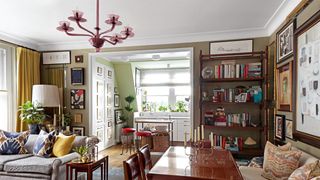 The seating arrangement incorporates a small sofa, two vintage campaign chairs, two leather footstools and a nest of tables. The dining table seats sixxc.comfortably and extends to seat even more. Custom-made oak shelving units are filled with books and collected objects, while the walls are covered in pictures. There are architectural drawings, botanical prints and pictures of fruit, as well as pieces by young British artists such as Annie Rouse. Some are drawings made by Martin when he was at school; others came with his father when he fled Poland for Sweden. Martin has also collected Andrew Norrey's abstract paintings for years and there are several throughout the flat.