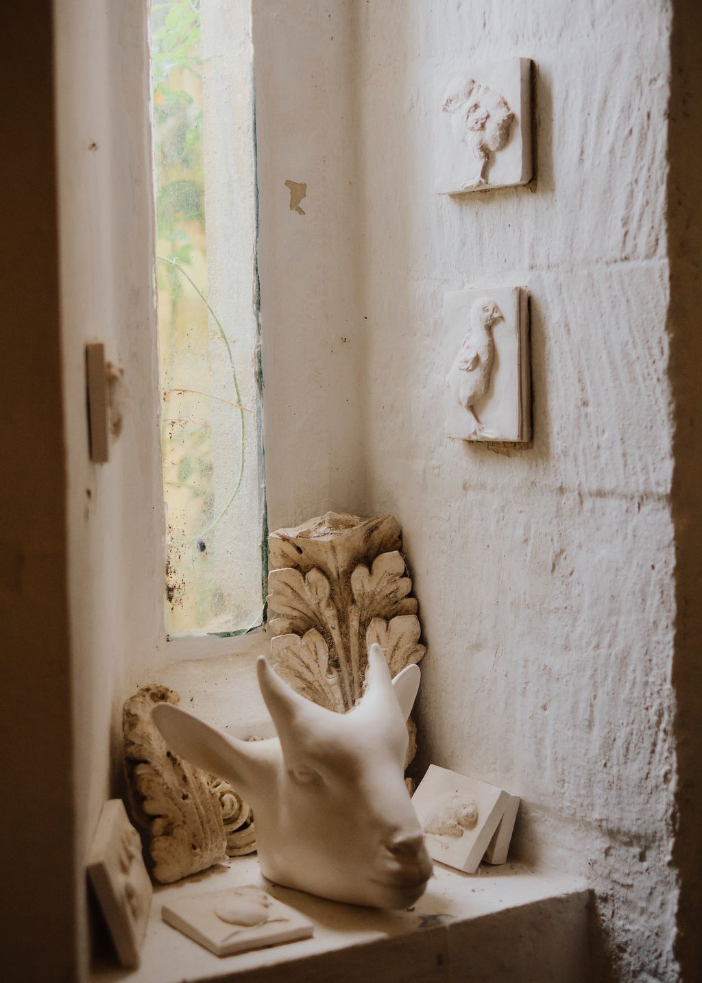 In contrast to the textured look and vivid palette elsewhere in the house, the décor here is pared back, leaving the architecture to speak for itself. A tall bed upholstered in chocolate-brown velvet and a chaise longue in pea-green and brown chintz provide the only notes of colour in the bedroom, while the adjoining bathroom is even more restrained. Yet to call it ‘minimal’ would miss its spirit. ‘It has this strange quality, almost like a hammam,’ Matthew says. ‘Lying in the bath and looking up at the vault is wonderful, especially when the wisteria spills through the window and green tendrils hang overhead.’
