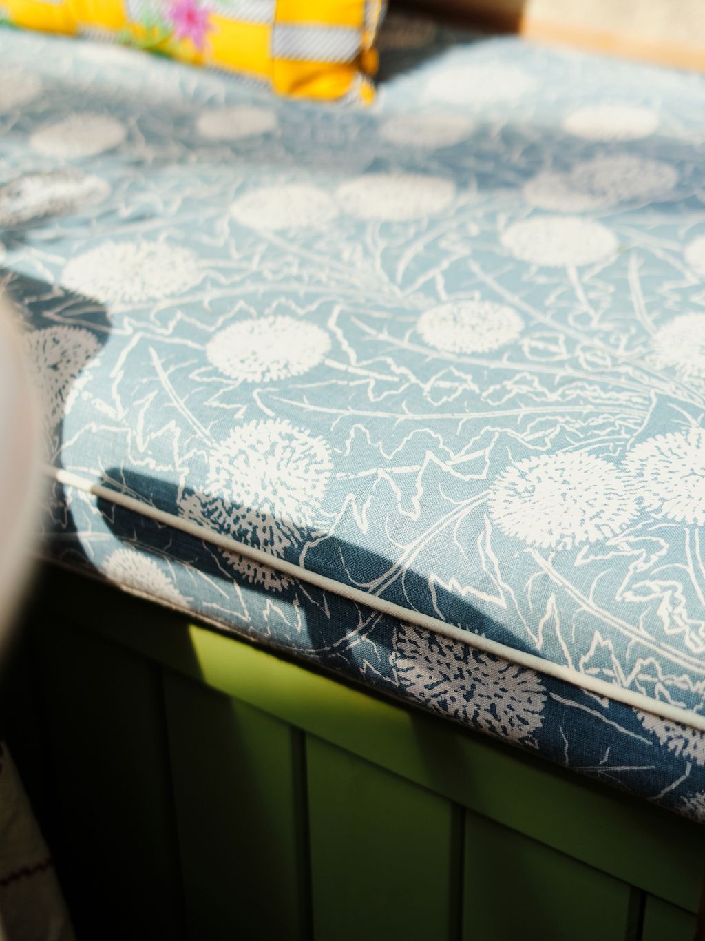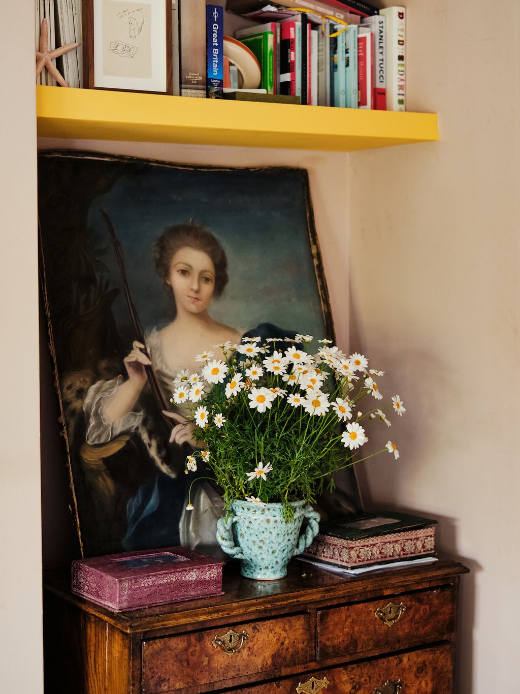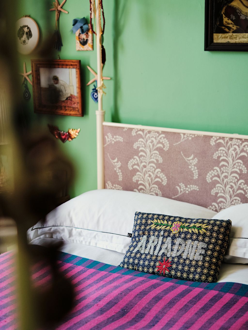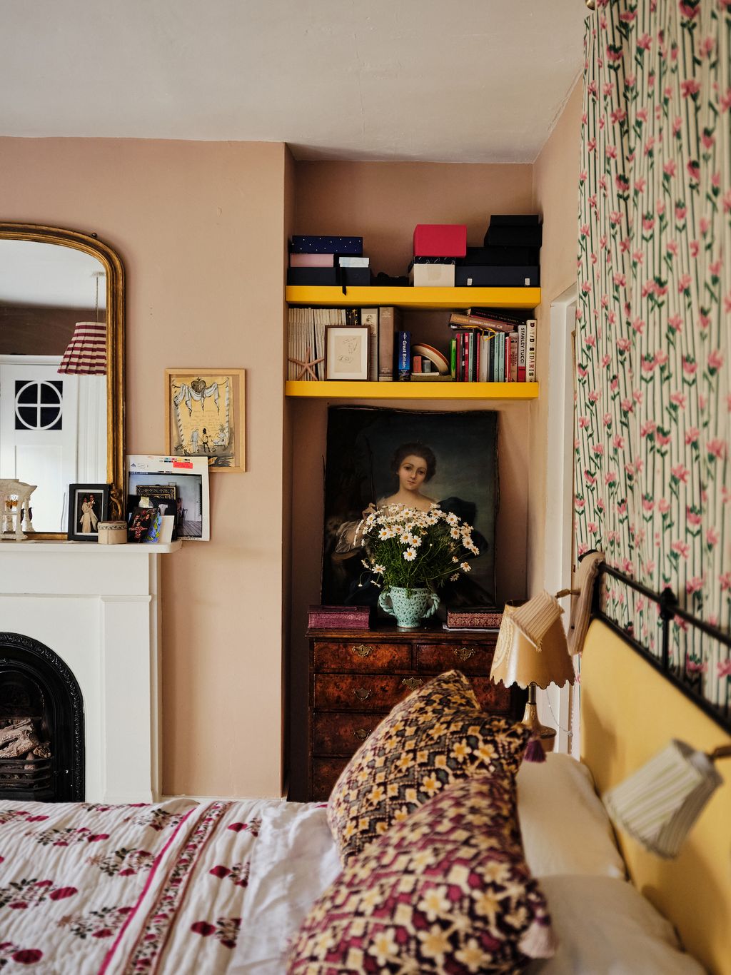 The dining room is painted a deep, zingy green, and in her bedroom Ariadne chose an arsenic colour, which she has layered with purple textiles and a collection of Iznik plates. Throughout the house the colour combinations are unexpected and fresh. In Olympia’s bedroom, walls in Farrow & Ball’s soft pink ‘Setting Plaster’, are mixed with pale lemon yellow textiles and old fashioned dark red and pink florals.