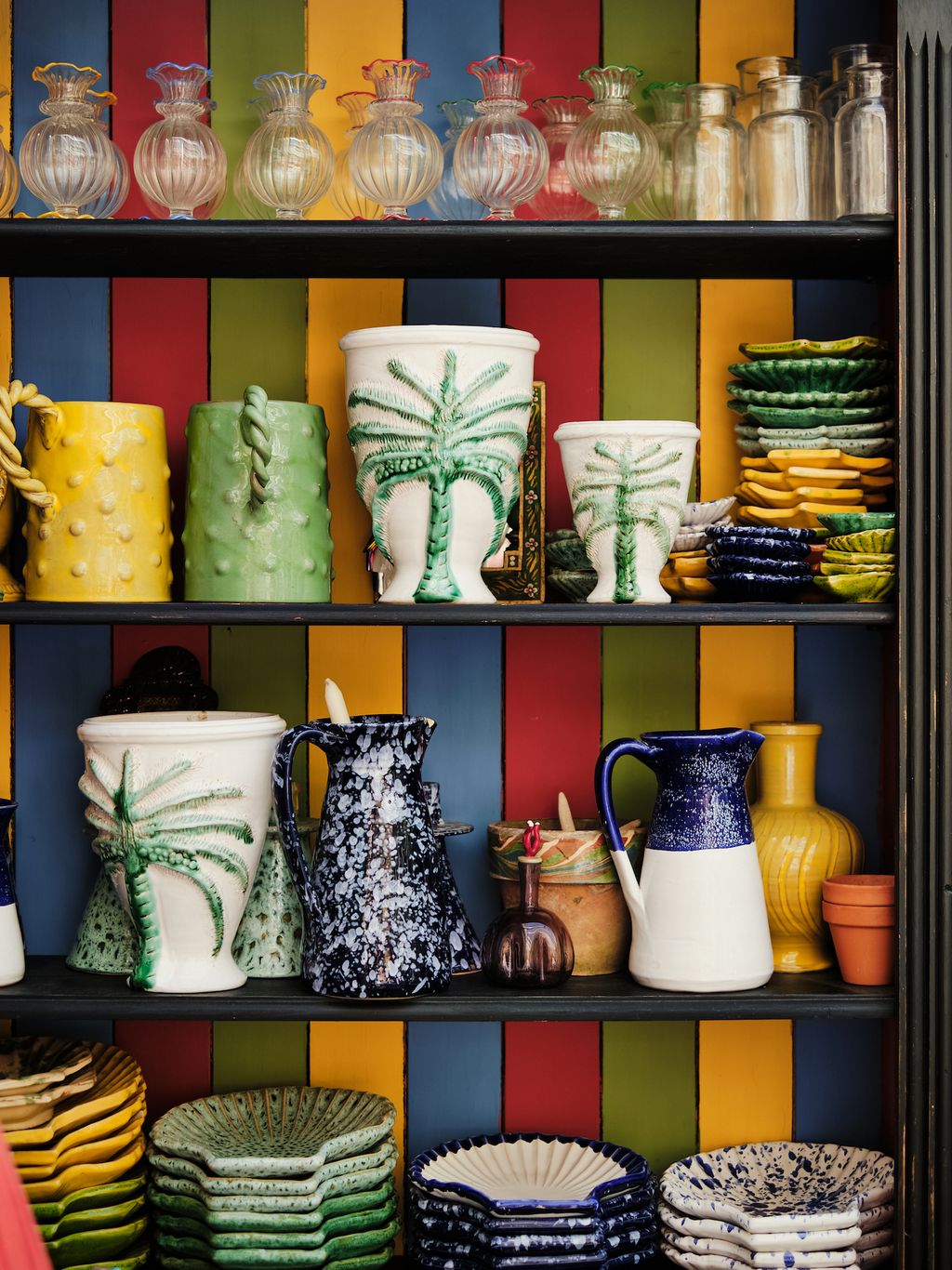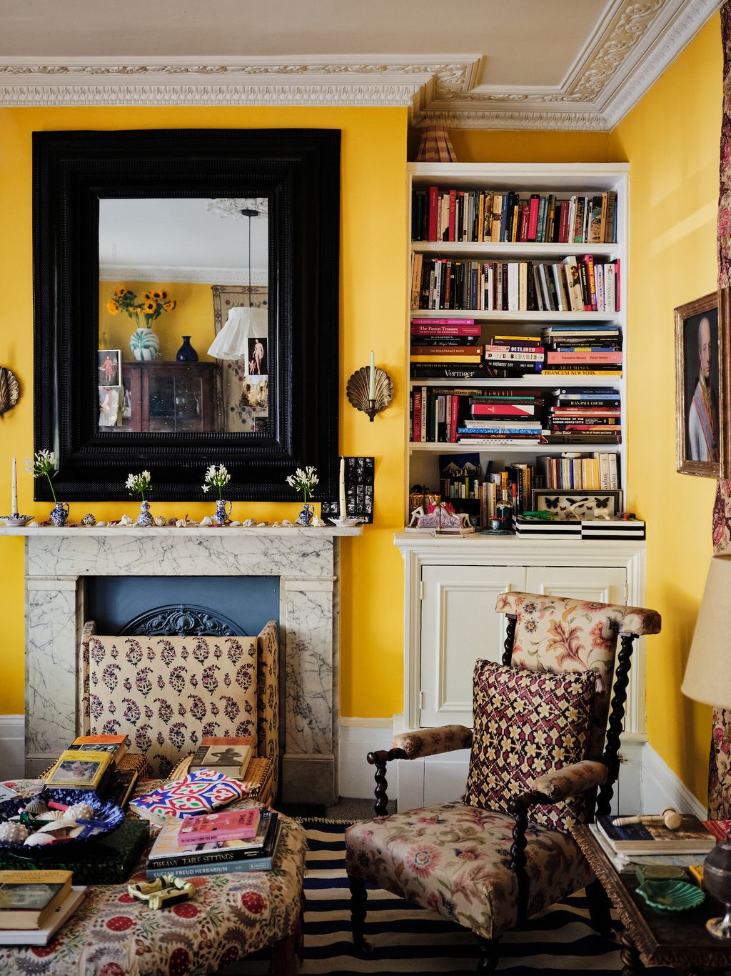 When the girls - who work with their mother, the textile designer Carolina Irving, to produce handmade ceramics and tableware for their company Carolina Irving & Daughters - took on the house, it was empty and painted white from top to bottom. Hard to believe now that the place is a cornucopia of antiques, patterned textiles and ceramics. Art, books, photographs and ephemera cover every surface. A bounty of objects of wildly varying provenance and preciousness. Shards of Murano coral and shells litter the mantlepiece in the sitting room. In the dining room a large glass bowl overflows with coloured matchboxes, and over the fireplace, flanking a 19th century Italian Empire mirror, stand two faux-marble columns topped with tumbling pots of ivy.
