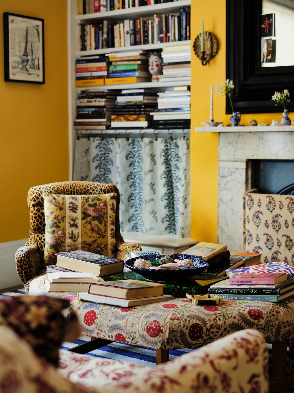 Working within the confines it being a rental, the girls have found hacks to give the scheme a sense of permanence. The first port of call was Papers & Paints where they sourced colour for the walls from the historical collection. The warm, ‘Imperial Chinese Yellow’ in the living room, somehow works as the perfect backdrop for a set of 18th century Thomas Frye Mezzotints, a Victorian chair upholstered in leopard print (‘It was the first thing our father bought from Robert Kime in 1985!’) and a 19th century Indian Tree of Life wall hanging.