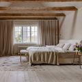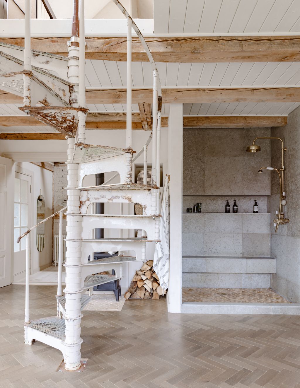Upstairs they have created a luxuriously vast bedroom and bathroom, removing the ceiling in the former so that the space opens right up into the eaves of the house, with the original wooden beams in between. Disliking the usual bulk of wardrobes that can take up so much volume in a bedroom, Laura and Nora have banished theirs to a corridor, creating a calm, airy space with a log burner and armchair to relax in, and a low bench to display objects. The bathroom, meanwhile, functions almost as an extra sittng room, with the unusual addition of a cast iron spiral staircase in the middle which leads into an office space.