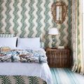 Pictured: 'Mariette' cotton bedlinen, from £18 for a housewife pillowcase, from Cologne & Cotton**. Eiderdown in ‘Wheatflower’ (green/blue/brown on oyster), linen, £207 a metre, from Bennison Fabrics**. ‘Marriage’ small papier-mâché box, covered in ‘D30A’ paper, €134, from Antoinette Poisson**. Wicker basket, £140 (used as table); ‘Bloomsbury Bobbin’ wood lamp, £410 excluding shade; both from Max Rollitt**.