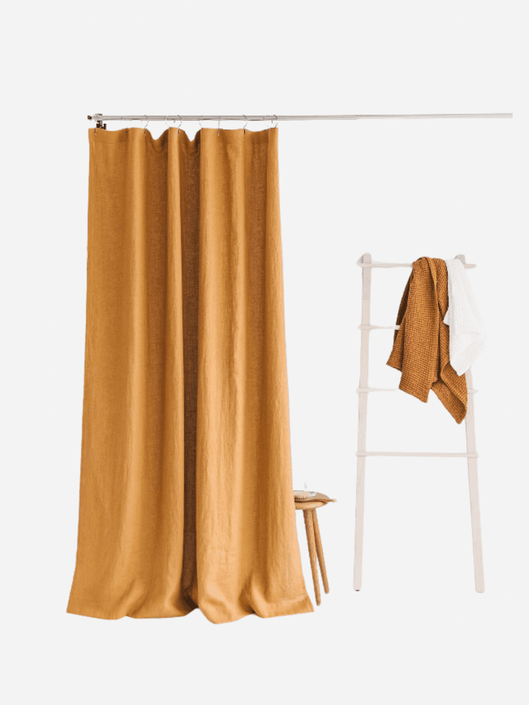 This striped shower curtain is pared back way to inject some colour into a bathroom, or to pick up hints of orange or yellow elsewhere. For those keen to dive into a bold colour palette, this linen shower curtain from Etsy has a luxurious drape to it and the colour is beautiful–just the ticket to warm up a characterless bathroom.