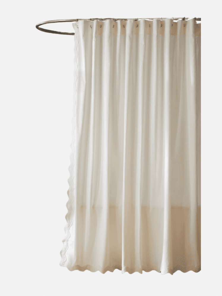 In Charlotte Boundy's London townhouse, she has employed pale pinks and dark wood in this small bathroom. To add some texture and break up harsh lines, she created a shower curtain from Pierre Frey's ‘Manosque’ in poudre with a waterproof backing. To create a similar effect, look to use a flounce-trimmed shower curtain or one in pale, spring-like colours. In a rental where redecorating may not be possible, this HAY one would be a pretty and easy way to bring personality to a tired or plain bathroom. Another option is this linen pick with valance from Etsy. Available in a wide range of custom colours, it's an easy-breezy shower curtain that will add texture to a plain white bathroom. For more frills and ruffles to help create a soft and feminine bathroom, consider these white curtains from Laura Ashley and Anthropologie.