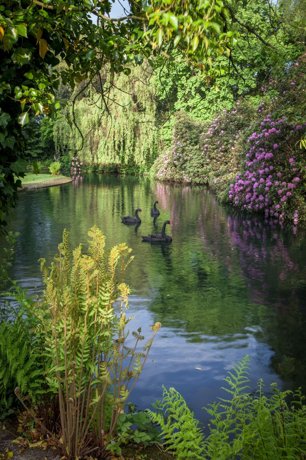 A backbone of formal hedging of yew and beech echoes other gardens, such as Rousham in Oxfordshire, designed by William Kent in the eighteenth century and regarded as one of the finest gardens of its type in England. Shute House shares its deliberately restricted colour palette, and the elements of water, stone and evergreen planting. A formal lake, with black swans that follow Suzy as she walks, contrasts with the informality of willow, fern and wisteria bordering the water. Each glassy surface acts as a mirror to the sky, so on still days you are not sure if what you are experiencing is real or a reflection in the water.