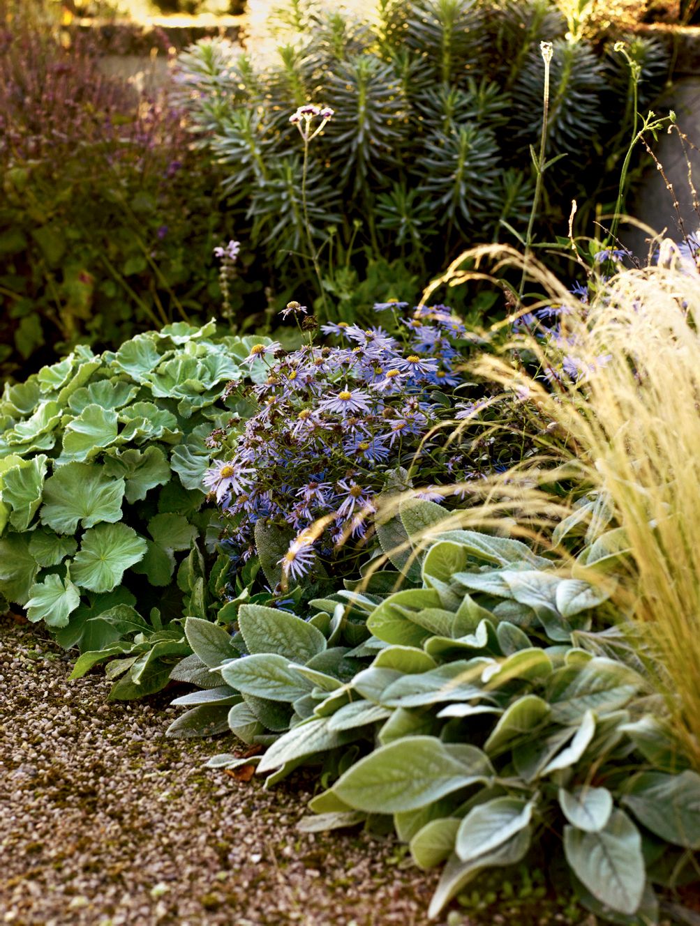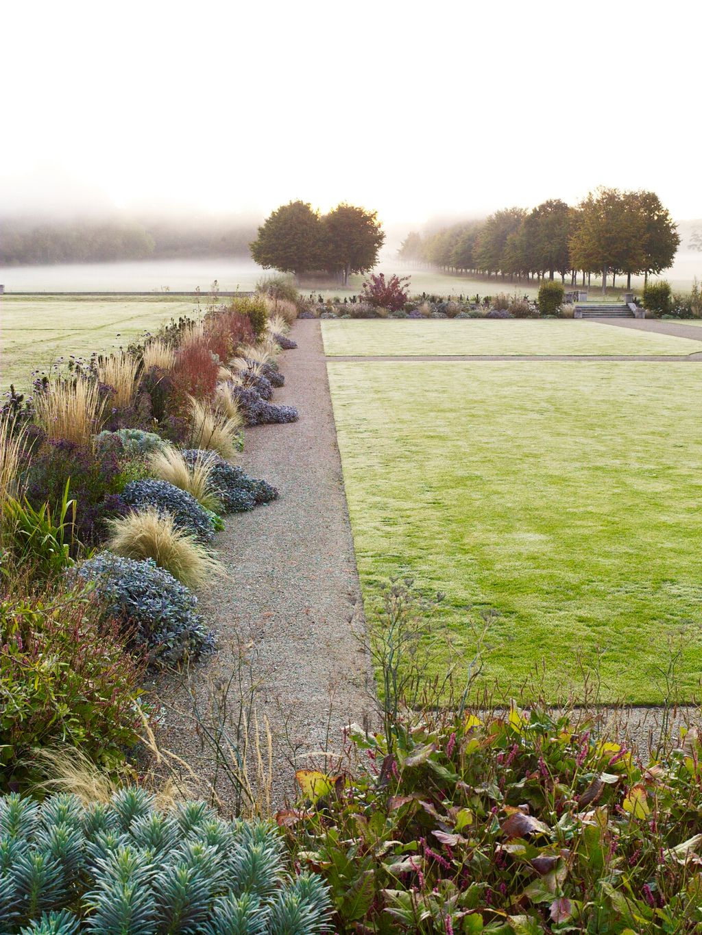 Inspired by the gardens of Gertrude Jekyll, Jane chose a palette of what she calls ‘bomb-proof’ plants of interesting texture, creating a sweep of colour from warm reds and purples by the house to whites and misty pastels, which could dissolve into the landscape at the avenue end. Lamb’s ears and purple sage were encouraged to spill on to the path, and she made a virtue of the breezy conditions by introducing Japanese anemones and grasses, which dance in the wind. The past few years have brought heat and drought conditions previously unheard of in damp, green Dorset: the garden has sailed through, looking beautiful well into November, when the last big, red, semi-translucent leaves drop from Cotinus ‘Grace’.