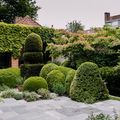 The space in front of the original house, with a terrace of reclaimed Belgian Blue stone, is more traditional in feel. It has flowering shrubs and evergreens shaped into domes and soft hummocks. The other area, by the modern building, is minimal and geometric, with hedges and trees clipped into straight lines around a simple rectangular lawn.