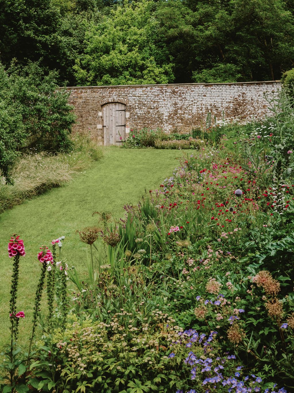 It was the garden, in fact, that saw the most significant interventions. As Thomas points out, ‘I wanted to enhance the relationship between the house and garden, without interfering with how it links to the agricultural land beyond.’ With the help of landscape designer and plantsman Peter Beardsley – a former right-hand man to Dan Pearson – huge tracts of brambles were cleared to make space for wildflower meadows that now snake around the house. ‘I learned a lot from the magical garden at Hanham Court and I wanted to bring some of that here,’ says Thomas. At the rear, the walled garden – flanked by an impressive bank of trees that were planted in the 1990s – spills over with a riot of cottage-garden favourites, including hollyhocks, foxgloves and geraniums.