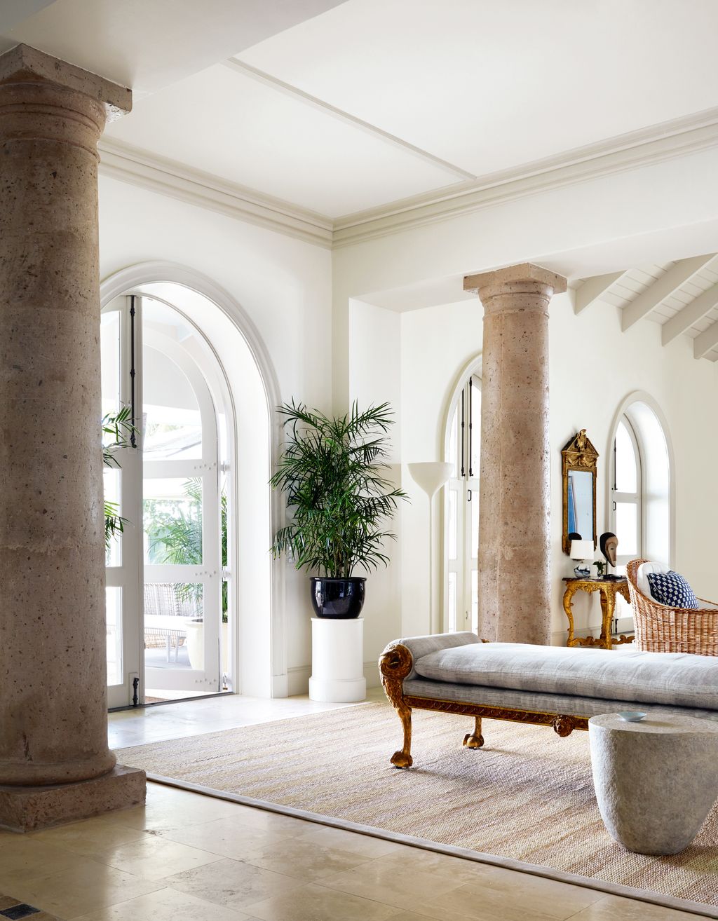Unusually positioned in the centre of the airy, pillared hall just beyond the front door is an 18th-century daybed. This is a tempting place for an afternoon nap, or simply daydreaming and looking out to sea. ‘Having something low means you get that important first glimpse of the ocean from the entrance,’ says Tino. In the adjacent drawing room, a pair of vast blue and white striped sofas stand back to back, alongside rattan chairs, a gilded mirror and a console table. Large abstract paintings complete the deceptively casual mix.