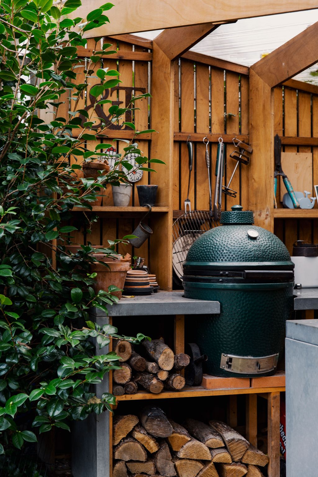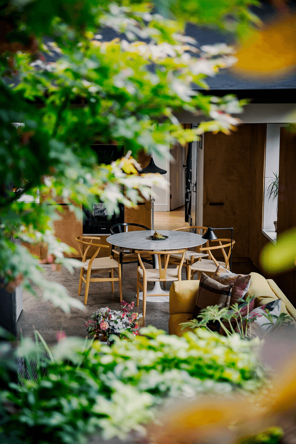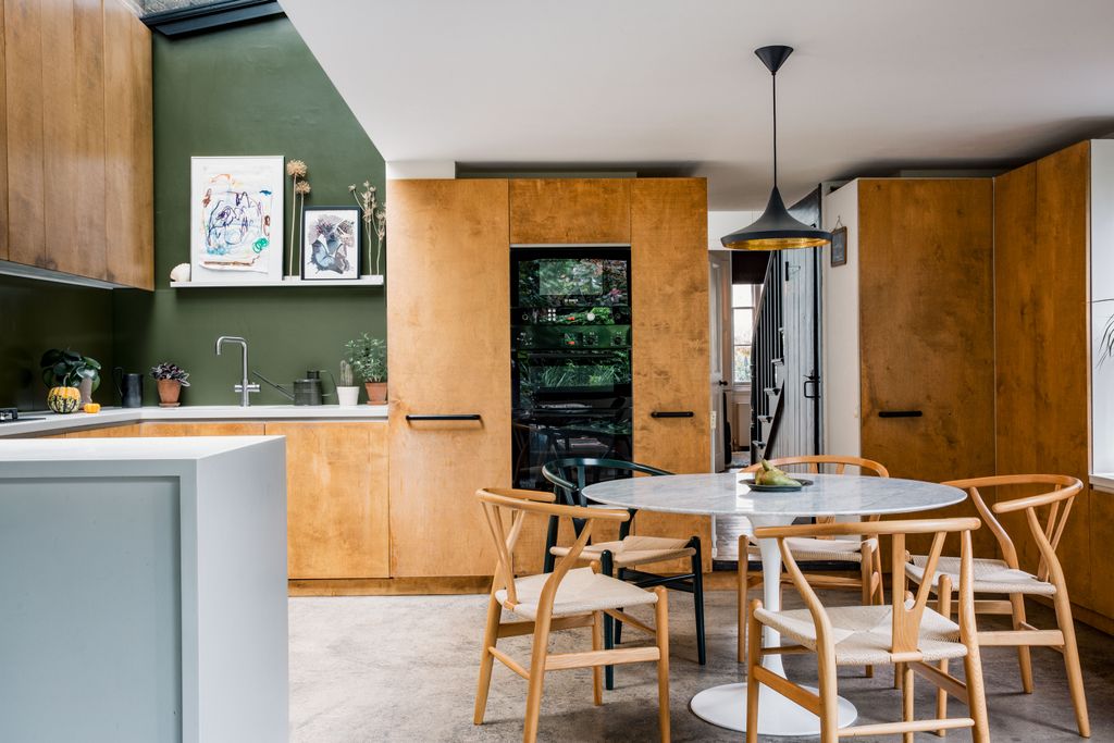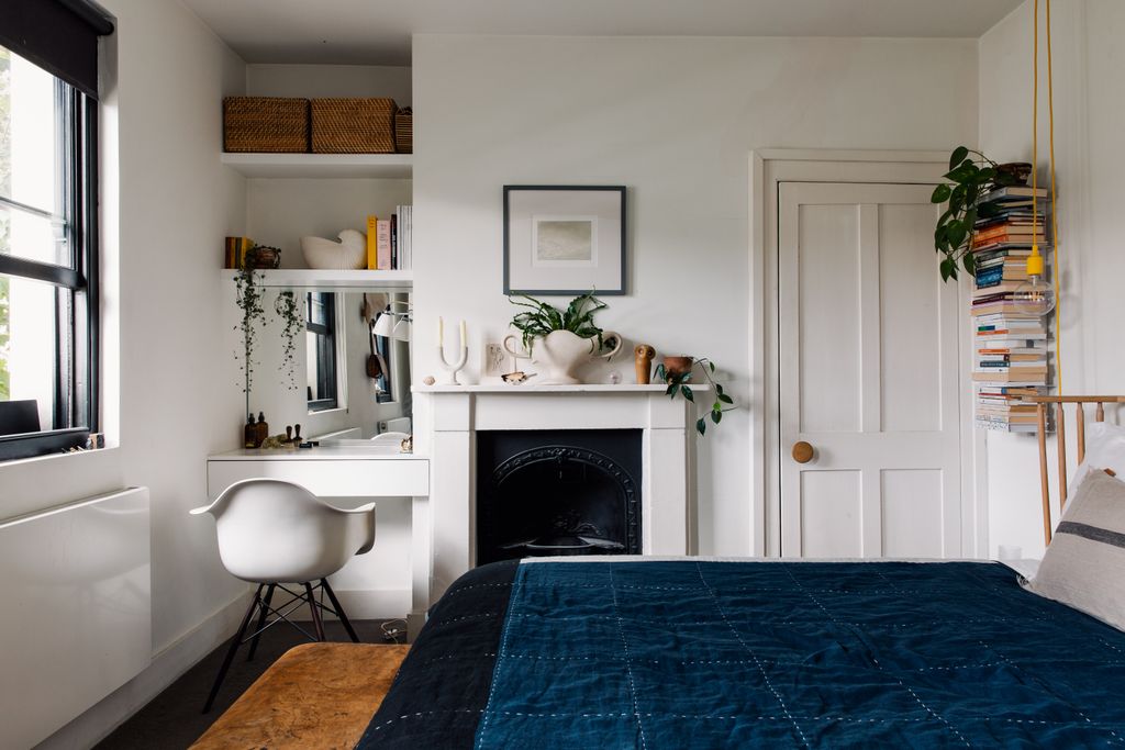 With the bones all in place, Connie and Tom have taken a gentle approach to decorating, allowing the house to slowly evolve and combining carboot and eBay finds with design classics. A wall of Vitsoe shelving in Connie’s studio was a fairly recent investment: ‘I’d wanted them ever since I’d been introduced them while I was working for design consultancy dn&co,’ she explains. ‘I love how they can be used in so many different ways.’ In the open-plan living, dining and kitchen area, Hans Wegner’s ‘Wishbone’ chairs encircle Eero Saarinen’s ‘Tulip’ table, while relaxed seating is provided in the form of a sofa from Muuto. ‘There were some pieces that we decided to really invest in, because we want them to outlive us,’ explains Connie, pointing out the Ilse Crawford bed in their bedroom too. The kitchen is Tom’s domain, with streamlined units made from stained birch plywood and extending from floor to ceiling in places to maximise the storage space available. Tom’s cooking space extends into the garden too where an outdoor kitchen it kitted out with his beloved Big Green Egg.