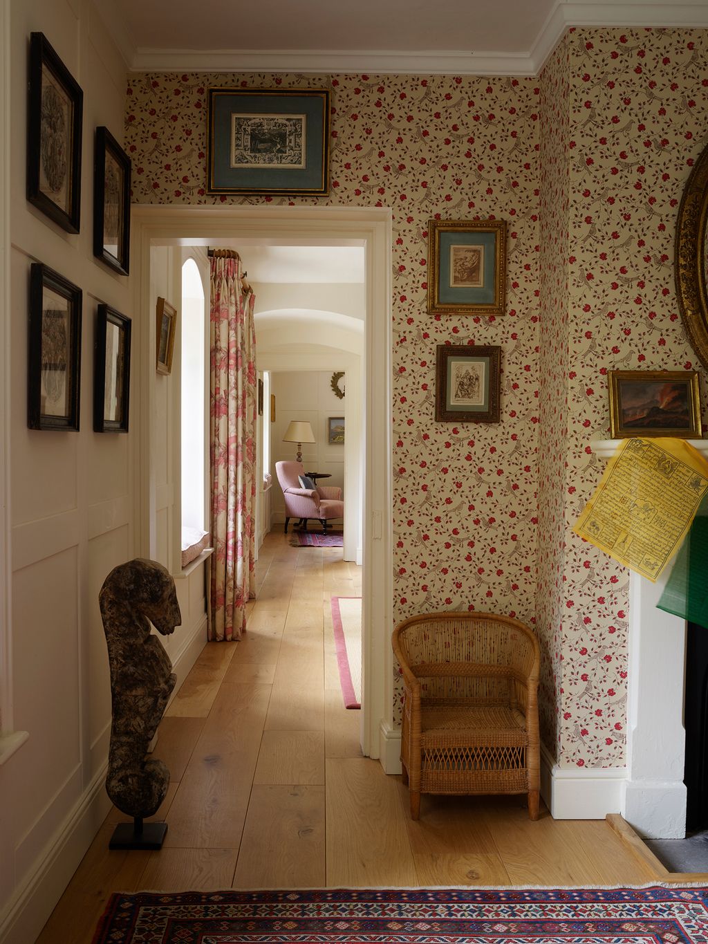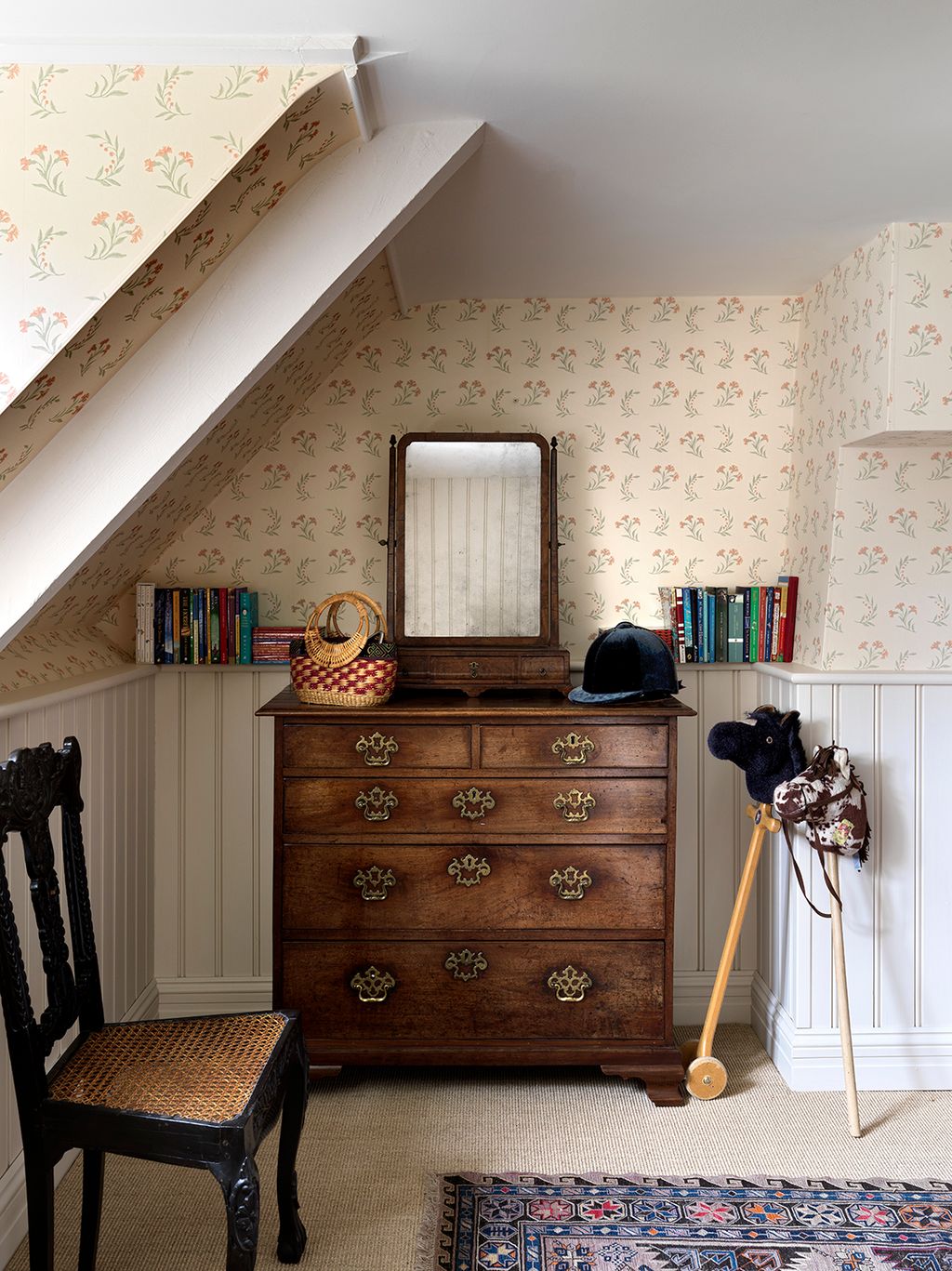 Upstairs, the bedrooms are pared-back and distinctly restful. Wallpaper makes an appearance in the daughter’s room–a leafy Marthe Armitage print that gives the feeling of a treehouse in the attic space. Tongue and groove panelling lends a laid-back rusticity, while antique rugs and more of the owner’s beautiful paintings unify the whole of these floors. No space is overcrowded with possessions; there are storage ottomans for hiding away spare bedding, but the whole is wonderfully uncluttered.
