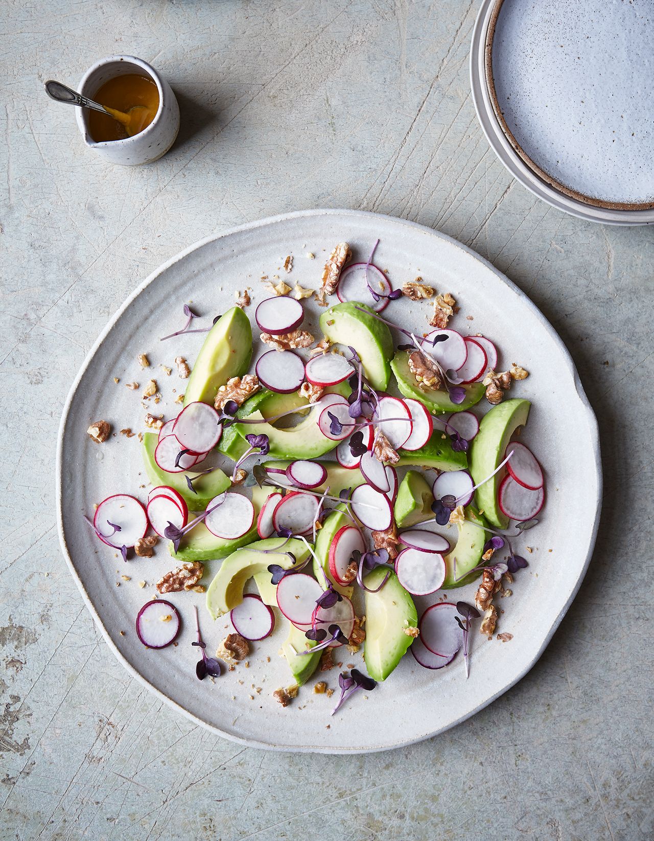 Creamy avocado, crisp radish and crunchy walnuts make a wonderfully vibrant salad, dressed with a fragrant vinaigrette