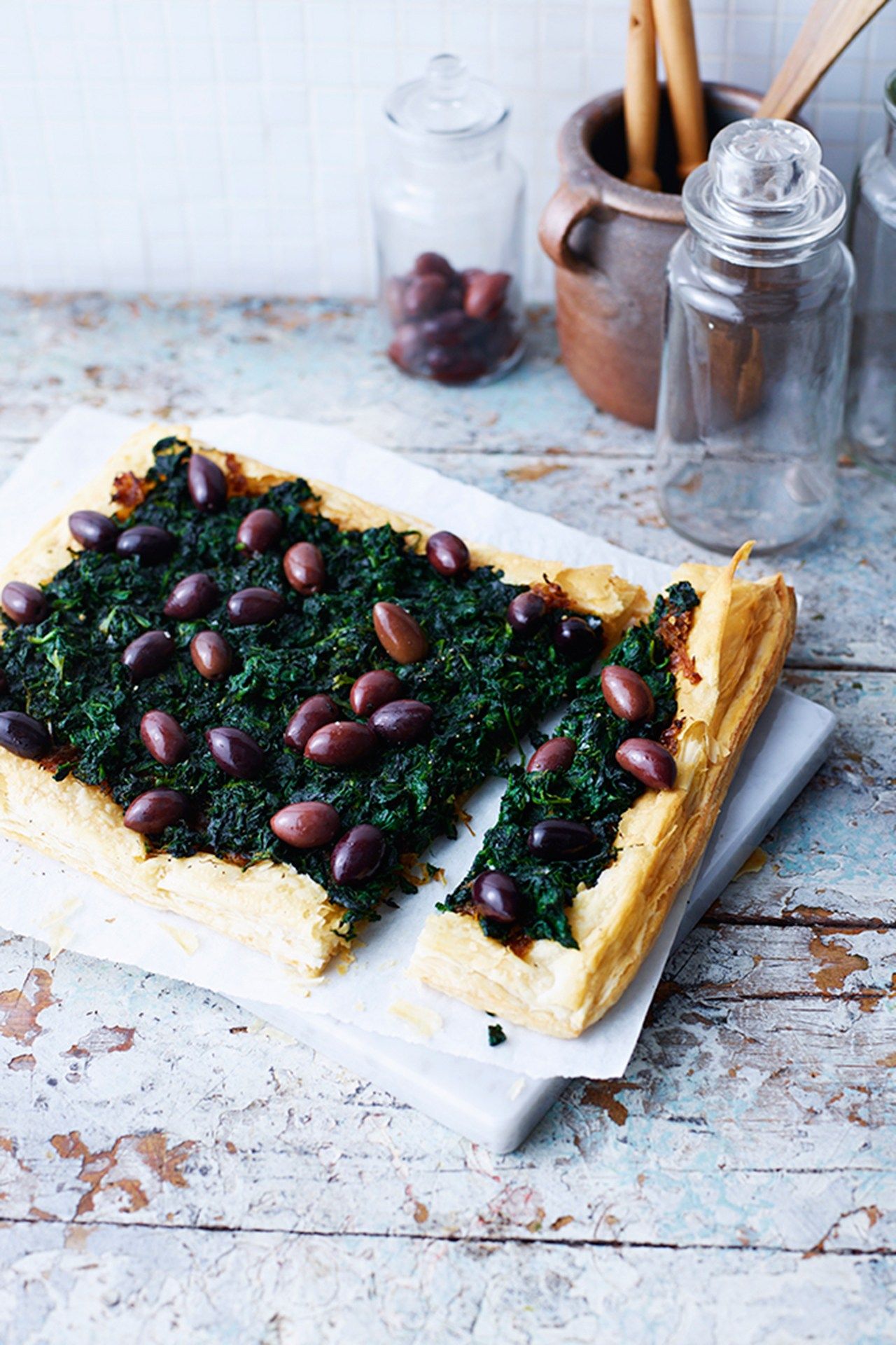 An easy onion, spinach and black olive tart recipe by Diana Henry, made with ready-made puff pastry.