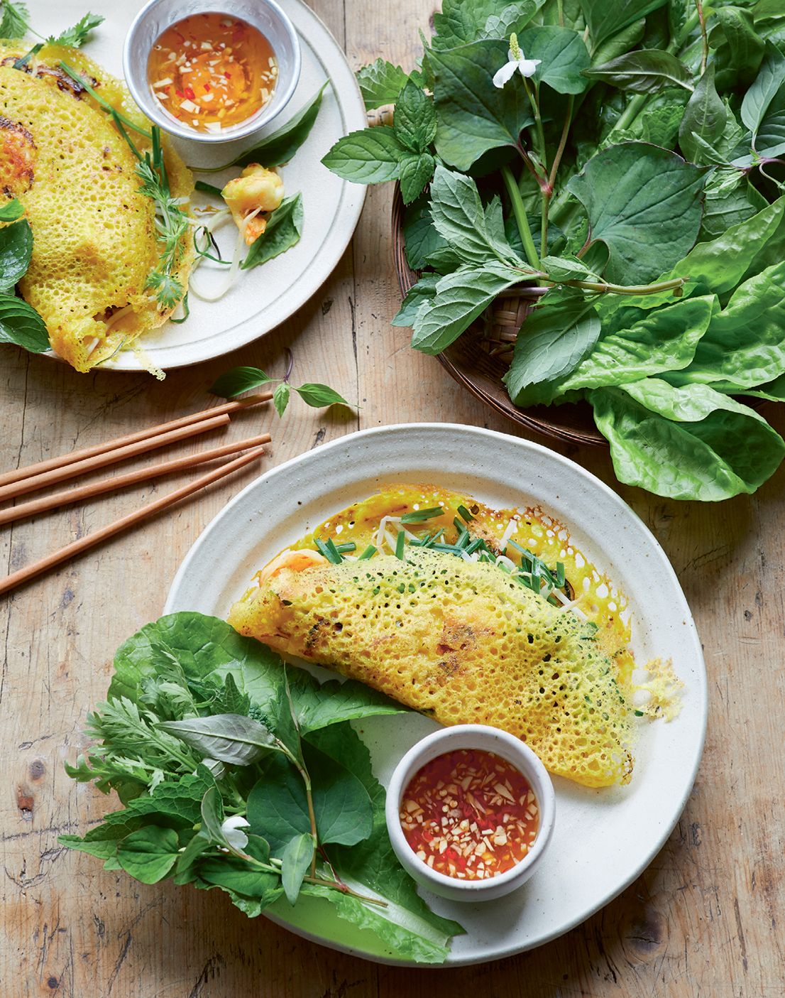 Bánh xèo is a light savoury crêpe, eaten with an abundance of salad leaves and herbs. You’ll need a 20cm non-stick frying pan with a lid to cook them. There’s a knack to eating them: gather a palmful of leaves and herbs into your hand, break off some crêpe onto the leaves, then roll it up and dip it into the sauce. You can vary the filling. Serves 6 as a starter or 2 as a main course.