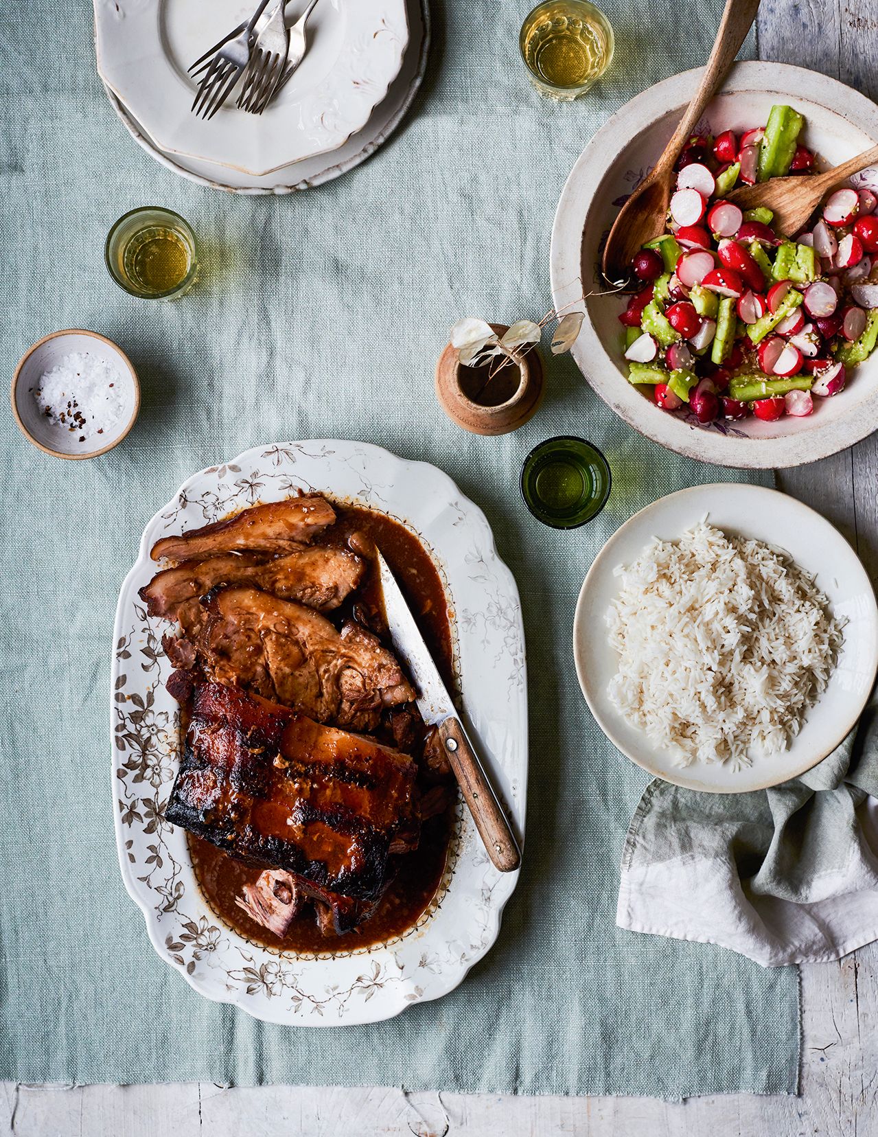 It is imperative to get good pork for this - a joint from the supermarket will not do. Apart from basting the meat for the last hour of cooking, this is hassle free, and so sweet and spicy everyone loves it