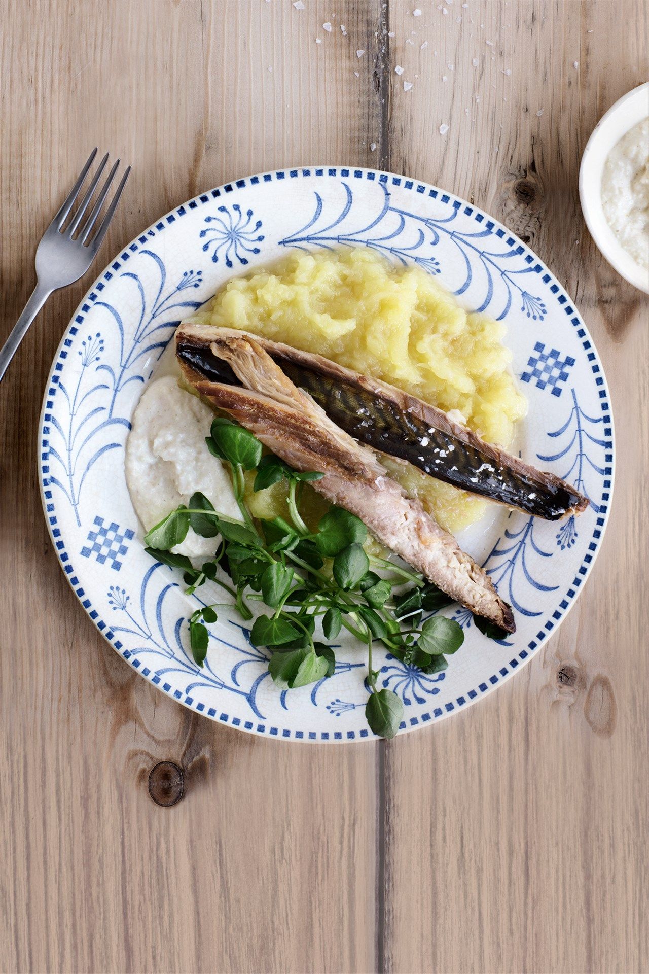 This simple dish can be served as a starter with brown bread and butter, or as a modest main course with boiled new potatoes. The firm yet silky texture and smoky flavour of the fish, with tart, buttery apple sauce and tangy, creamy horseradish is an interesting, subtle combination.