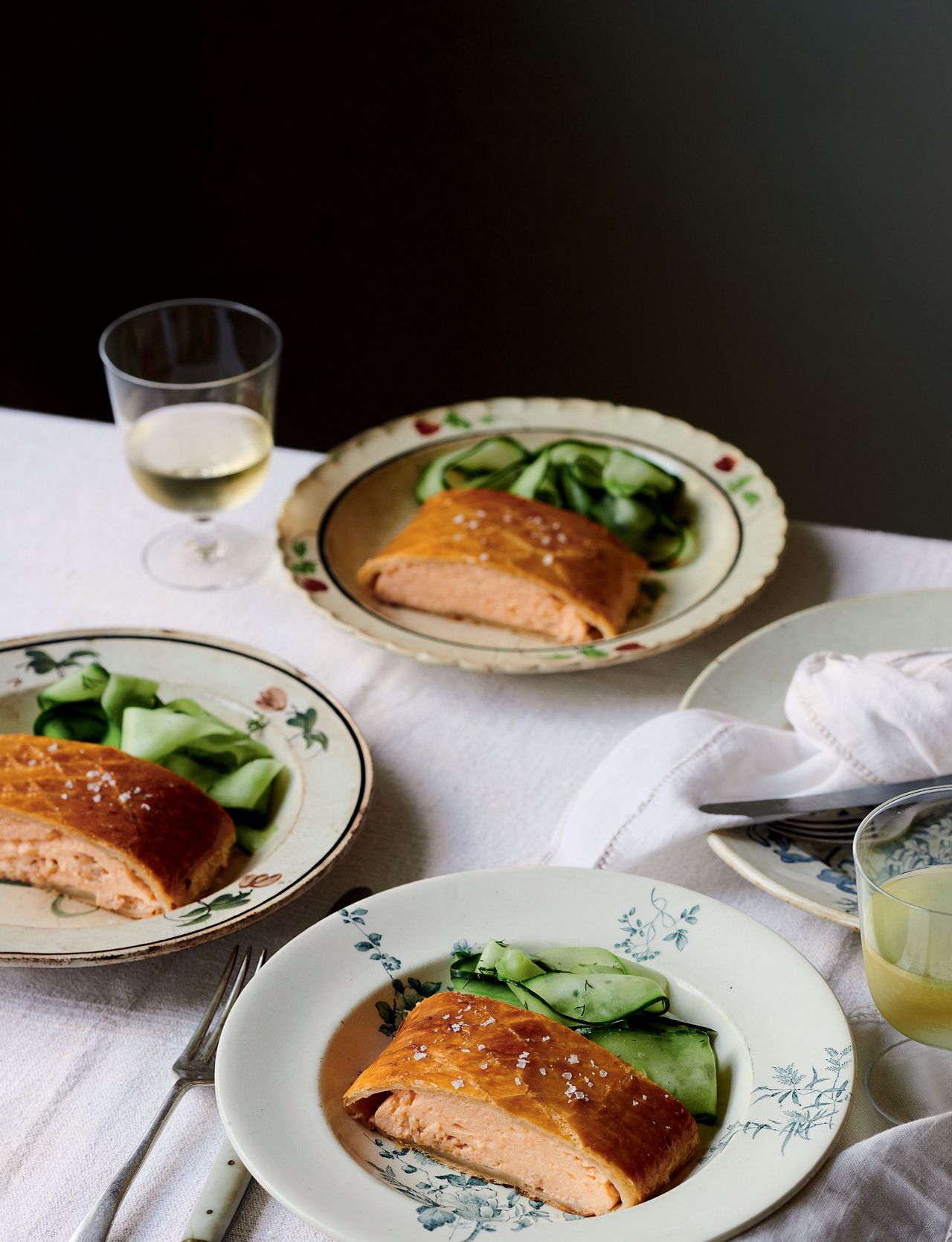 An early Easter is a mixed blessing. Good to have Lent over and done with, but it is a bit of a false dawn. When Easter is in April, there is a chance of a few early fruits and vegetables, but March is basically winter. My pie is more like a sausage roll, but there is no reason not to make it round. You can easily substitute salmon for the trout.