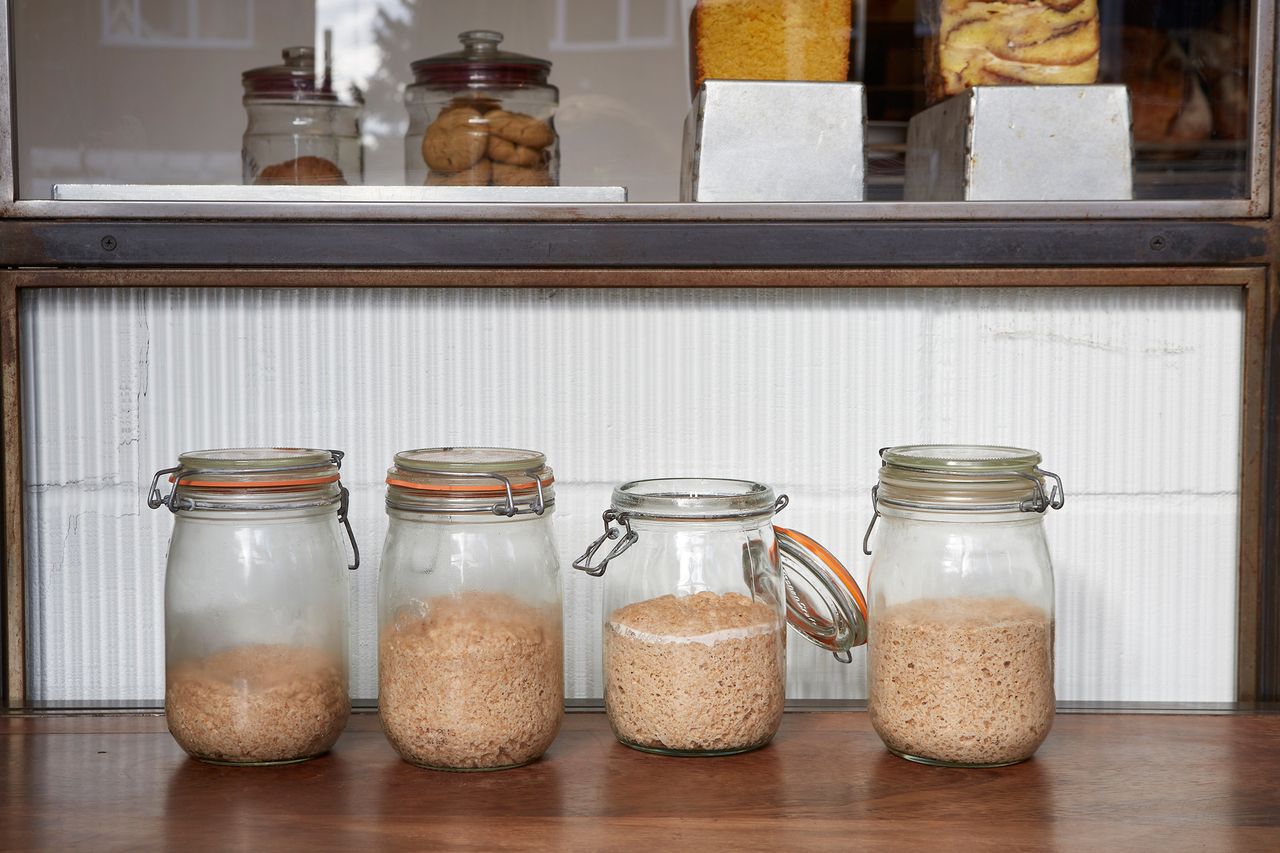 The act of combining flour and water and leaving it to ferment will create a starter that provides the natural leavening for the dough. Wheat or rye flours are commonly used to make a starter and the yeast and bacteria that are naturally present on the grain are harnessed, concentrated and trained to behave in a predictable way.