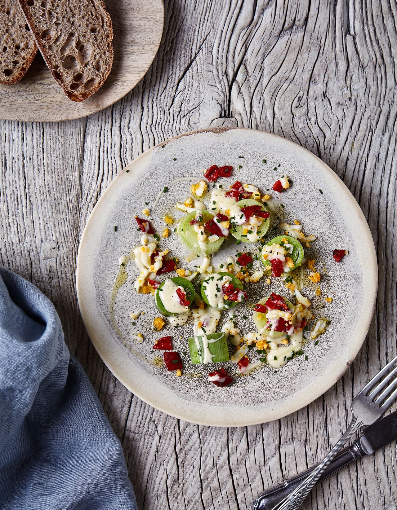 Sweet and sour leeks with egg, peppers, chives and cream
