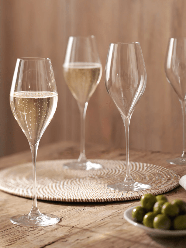 When it comes to the glass, champagne is best served in a tall, tulip-shaped glass. The height of the glass is important as it allows the bubbles to swell as they spiral to the surface. The narrowness of the mouth is also important; this prevents too much air exposure, so the bubbles are not lost. The traditional straight, narrow flute is not necessarily the best vessel, however, as a bit of width in the glass allows aromas to develop. Most sparkling wine producers serve their own wines in something resembling a normal white wine glass, but an elegant tulip is top of our list.