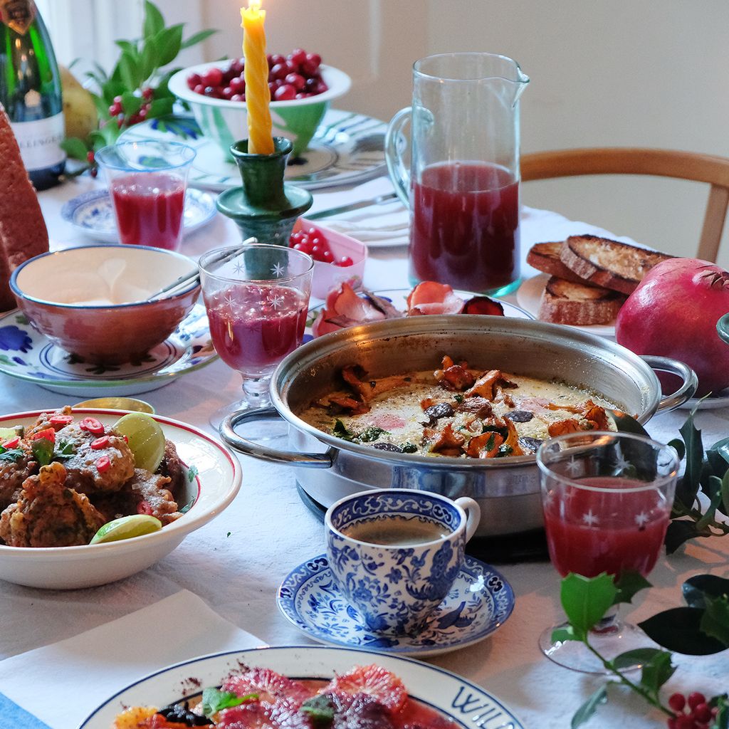 When it comes to Christmas, we love the whole shebang. It’s the one time that you can really let go – nothing is too much. We like to have the house looking festive from the beginning of December: the tree shimmering in the hallway, candles lit, every spare nook and cranny filled with holly, mistletoe, winter fruits and chocolate coins. Christmas carols blasting (we have a few Christmas LPs which crackle away on the record player, which does make it feel extra special) and a wonderful excuse to pop a bottle of bubbles at any moment.