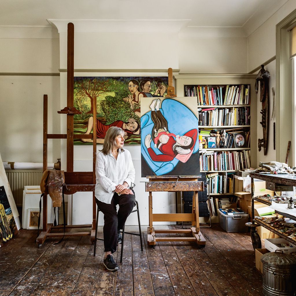 Eileen has never wavered in her devotion to figurative art, even when conceptual art was de rigueur. ‘I felt I didn’t have a choice – it’s like the nose on your face, you’re stuck with it.’ Bold outlines are married with expanses of flat colour, recalling the primitivism of the avant-garde, while her subject matter speaks of relationships, female sexuality, fertility and the practical balance of life, interwoven with elements of mythology and magical realism. A narrative ambiguity allows scope for interpretation and there is physical space, too. ‘Like a stage set, I only put in what is needed,’ Eileen explains. At the crux is her own life. It was the birth of her children that saw her start painting women as mothers. She worked when her boys napped and took to wearing ‘overalls and gloves so, as soon as they woke, I could be clean and ready to feed them’. Later, they painted alongside her after school.