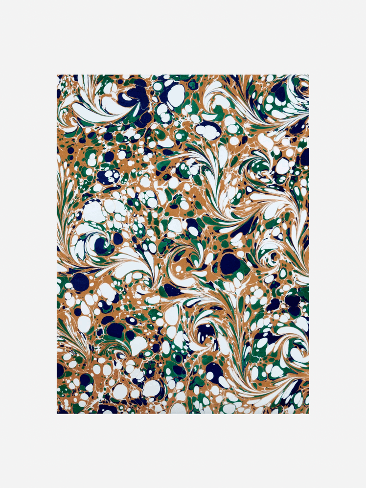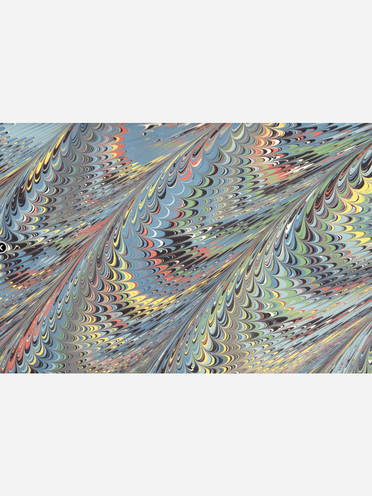 Marbling was developed in East Asia and the Islamic world thousands of years ago, and multiple different techniques have been employed throughout history, but in Europe, it first saw popularity in the late 17th then 18th centuries, as folios and albums of marbling were brought back by visitors to the Middle East (interestingly, marbling was used as a security method by those who needed to verify that different halves of documents matched one another, supposedly including American Founding Father Benjamin Franklin).