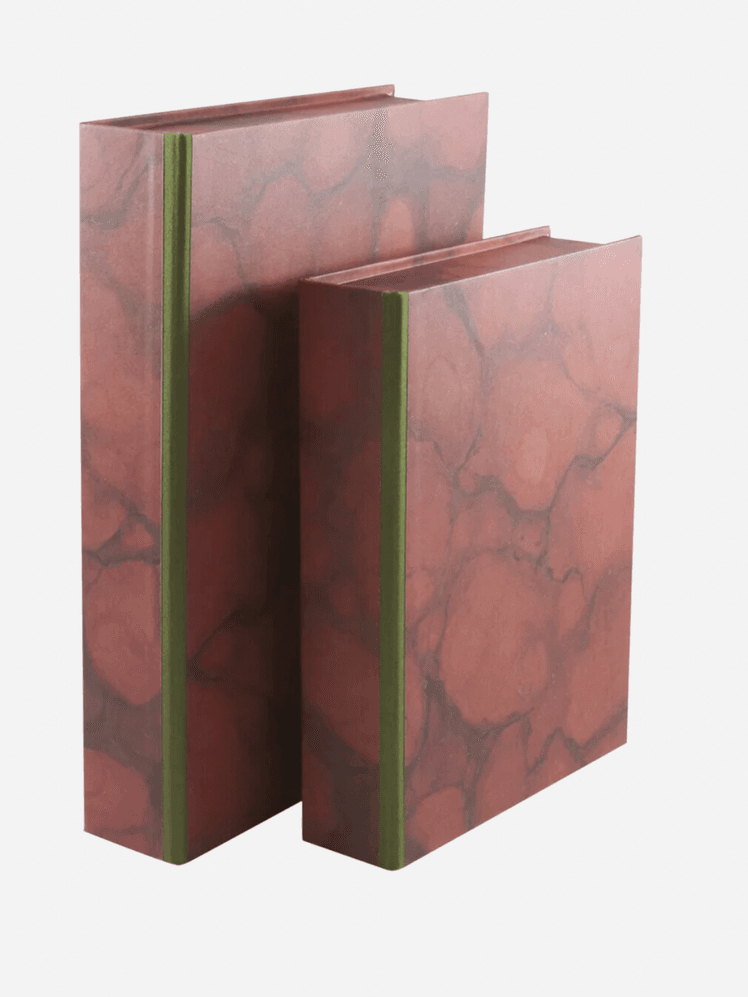 Simply put, marbling is a visual trick that recreates the effect of veined marble in a non-marble surface; it is a little like an applied terrazzo effect, but with more flowing shapes than the chipped, flecked marble used in that style. It is usually applied by using coloured ink suspended on top of a thicker liquid, into which the desired surface is carefully dipped and then removed and left to dry.
