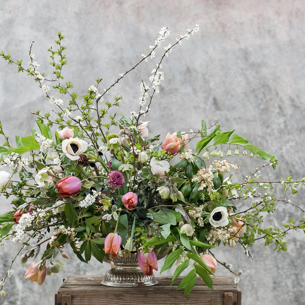 The vase she has used is an open, silver bowl that suits the loose, natural look of the arrangement. 'It's all in the vase. Choose your vase first and let that inform what you are picking. At the moment, I'm really favouring the wide-necked vases where you can display a good range of flowers,' she says, and explains she uses chicken wire in the bowl to support the flowers, putting in the main ones first and building the arrangement around them. 'When people ask, "How do you keep your tulips straight?", my reply is, "Why do you want them straight?" Part of the joy of tulips is the way they arch and grow when they are arranged.' Tulips and many other spring bulbs have an excellent vase life, lasting a good two weeks if you keep changing the water. 'Always cut the stems at an angle so that there is more surface area to absorb the water,' says Rachel.