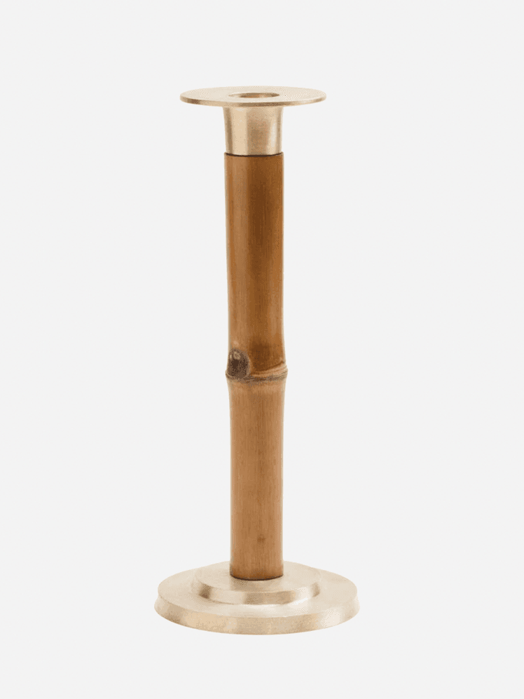 The scheme in this room by Phoebe Hollond centres around the lightness of the green on the bookcase contrasting with the heaviness of the antique furniture and oversized lights. This sense of drama can be recreated by pairing wooden candlesticks and cutlery with light green candlesticks, and layering green ceramic plates over teak plates. Pairing this with blue striped napkins in a similar colourway to the Vanderhurd fabric on the chairs add a jolt of colour to the scheme, which would look lovely in a country house setting or on tables strewn across a lawn under a constellation of lights.